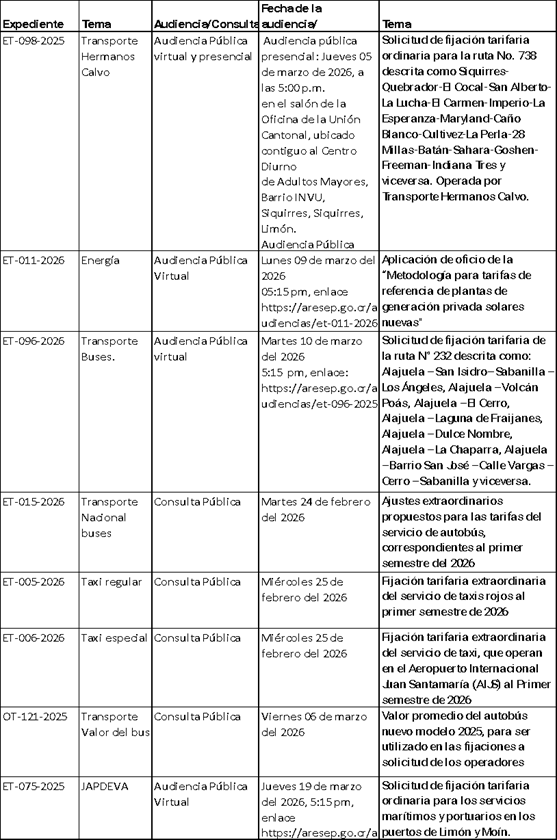 La Autoridad Reguladora de los Servicios Públicos (Aresep) convoca a las audiencias que se realizarán durante febrero y marzo de 2026.