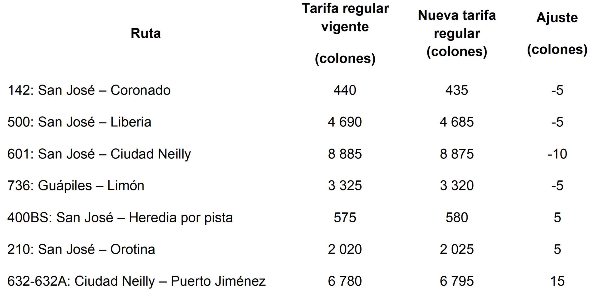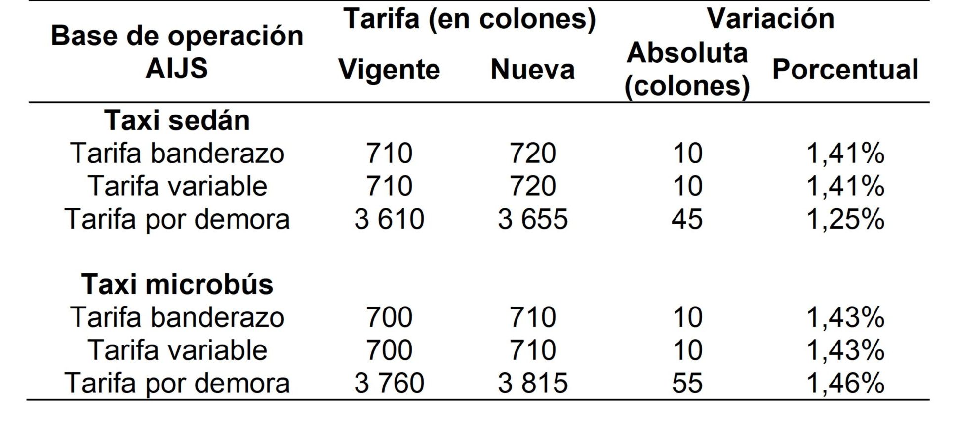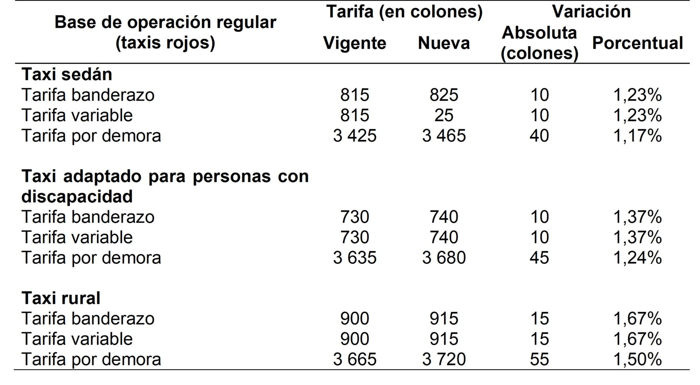 En el caso de los taxis rojos y los que operan en el Aeropuerto Internacional Juan Santamaría (AIJS) se proponen aumentos entre ₡10 y ₡15 en las tarifas de inicio del recorrido (banderazo) y en cada kilómetro adicional de recorrido (tarifa variable). En la tarifa por demora (el tiempo que tarda el servicio) los ajustes son entre ₡40 y ₡55. A continuación en la siguiente tabla se resume el ajuste por base de operación y tipo de vehículo: