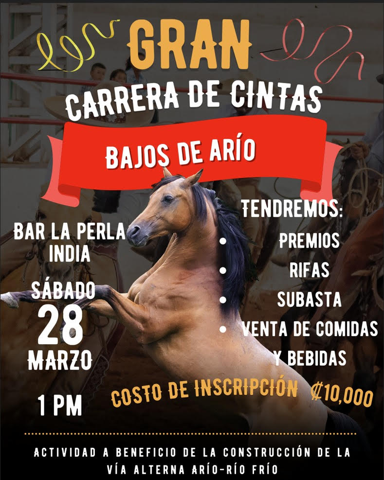 La Asociación de Desarrollo Integral de Río Frío y el Comité de Vecinos de Bajos de Arío organizarán el próximo sábado 28 de marzo de 2026 la Gran Carrera de Cintas de Bajos de Arío, una jornada comunal cuyo objetivo es recaudar fondos para la construcción de un camino alterno que permita mejorar la conectividad en la zona durante la temporada lluviosa.