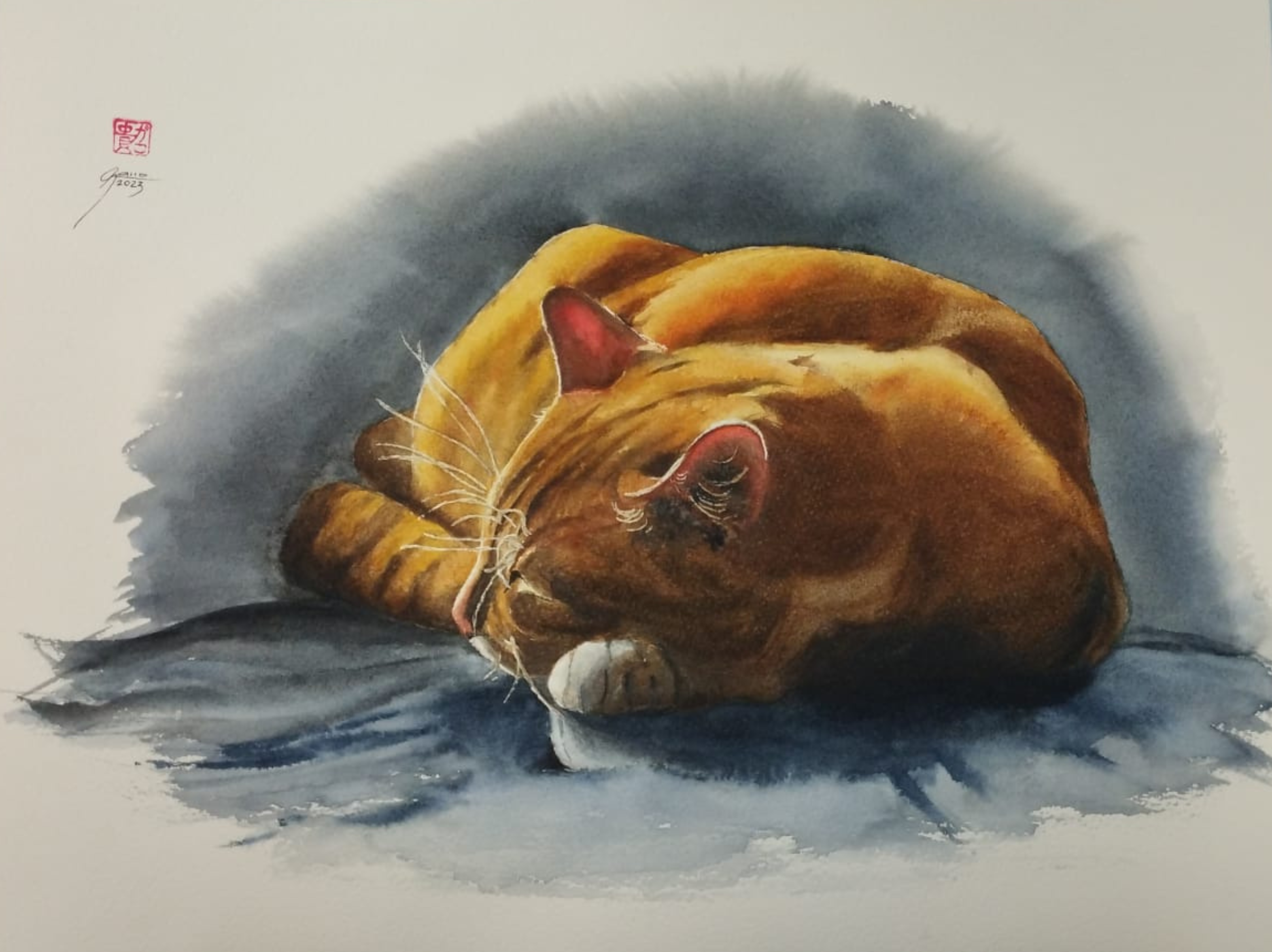 La muestra reúne 30 obras en acuarela de formato pequeño, realizadas sobre papel 100 % algodón, en las que Gallo retrata gatos domésticos en escenas cotidianas.