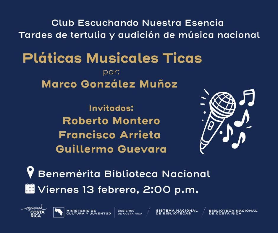 Actividad del ciclo Escuchando nuestra esencia: tardes de tertulia y audición de música nacional. Conversatorio dedicado a la música costarricense, donde especialistas e invitados dialogan sobre la creación, historia y evolución de la música nacional. La sesión se complementa con audiciones comentadas que fomentan la apreciación del patrimonio sonoro del país.