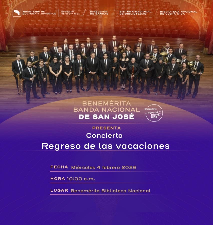 La Benemérita Banda de Conciertos de San José ofrece un concierto especial para dar la bienvenida al inicio del año cultural, con un repertorio variado dirigido a todo público. La actividad busca acercar la música de concierto a la ciudadanía y promover el disfrute del patrimonio musical costarricense.