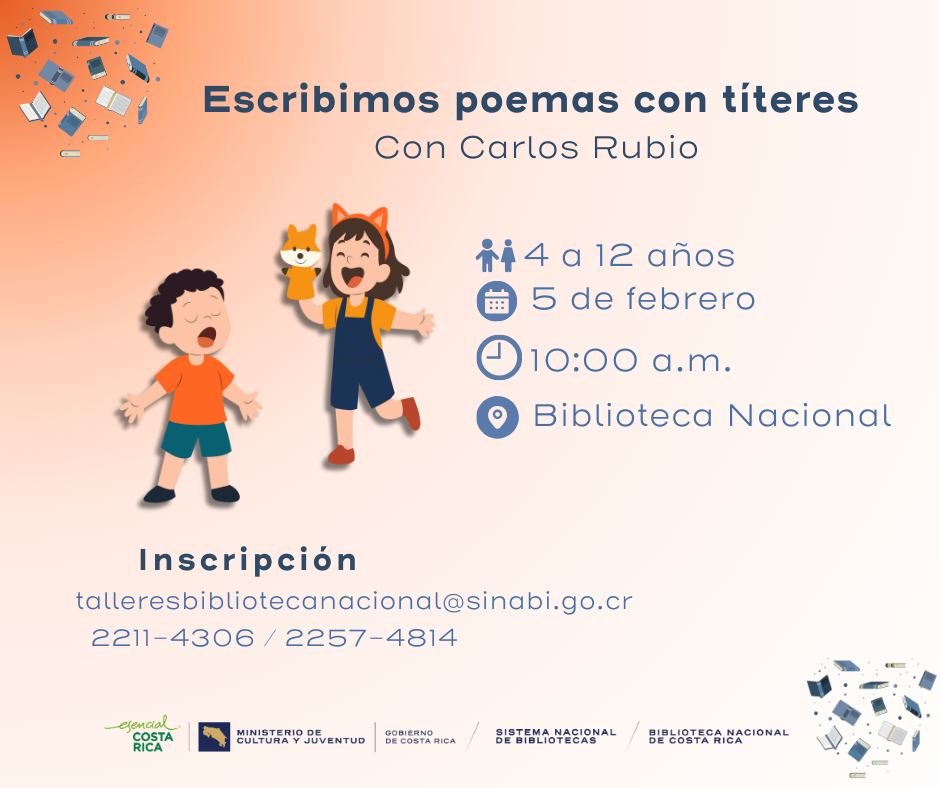 Taller dirigido a público infantil (4 a 12 años) que estimula la creatividad mediante la escritura poética y el uso de títeres como recurso expresivo. Las personas participantes explorarán el lenguaje, la imaginación y la narración de forma lúdica y participativa.
