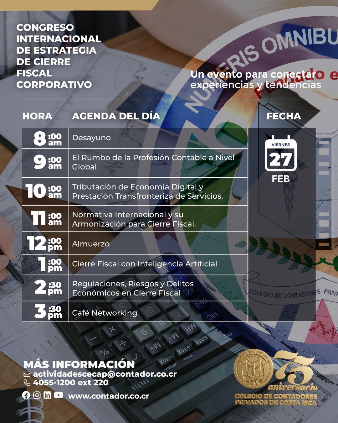 El Colegio de Contadores Privados de Costa Rica realizará este viernes el Congreso Internacional de Estrategia de Cierre Fiscal Corporativo, donde se tratarán las experiencias y retos de empresas y personas contribuyentes, así como de contadoras, en un mundo transnacional, virtual y global.