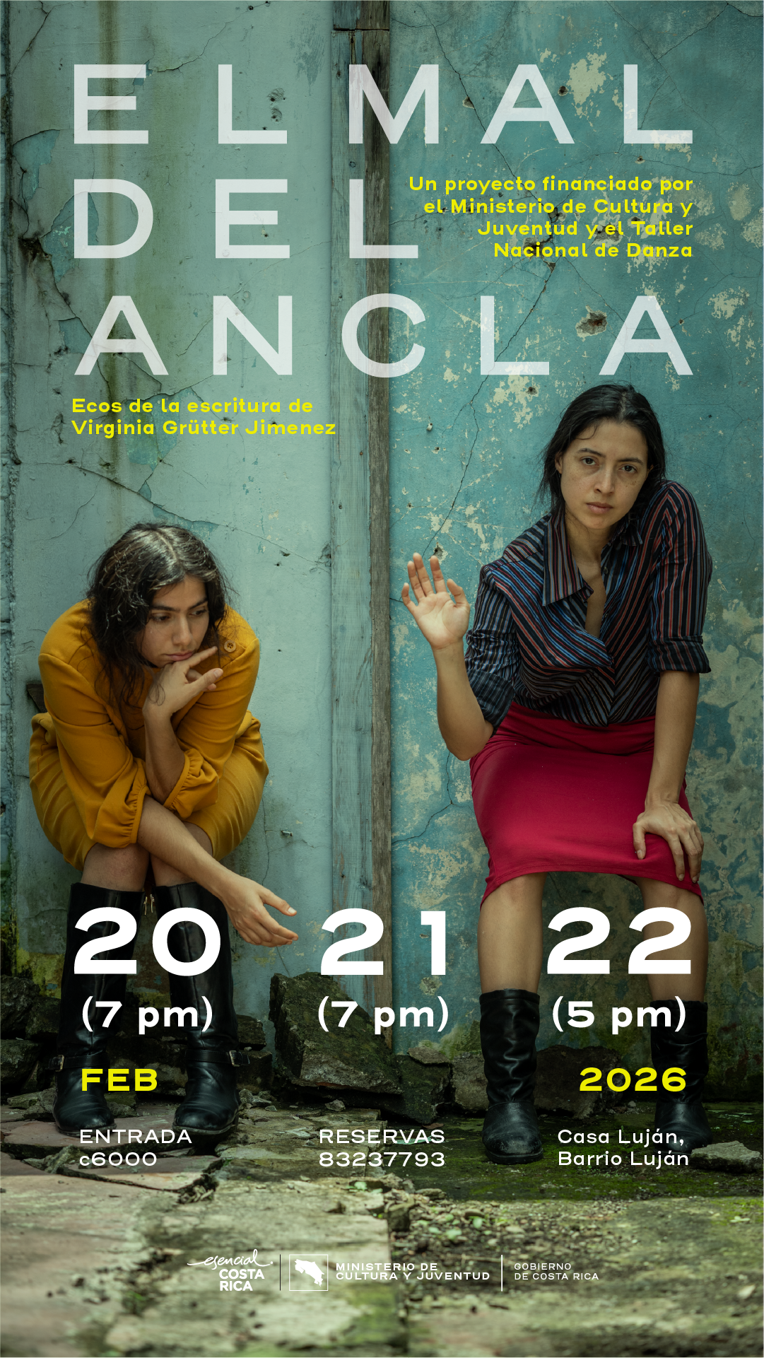 La obra de danza contemporánea EL MAL DEL ANCLA. Ecos de la escritura de Virginia Grütter Jiménez se estrenará los días 20, 21 y 22 de febrero de 2026 en Casa Luján, ubicada en Barrio Luján, San José. La propuesta toma como punto de partida la poesía de la escritora costarricense Virginia Grütter Jiménez, cuya obra aborda temas como la memoria, la violencia y la persistencia de la voz femenina.