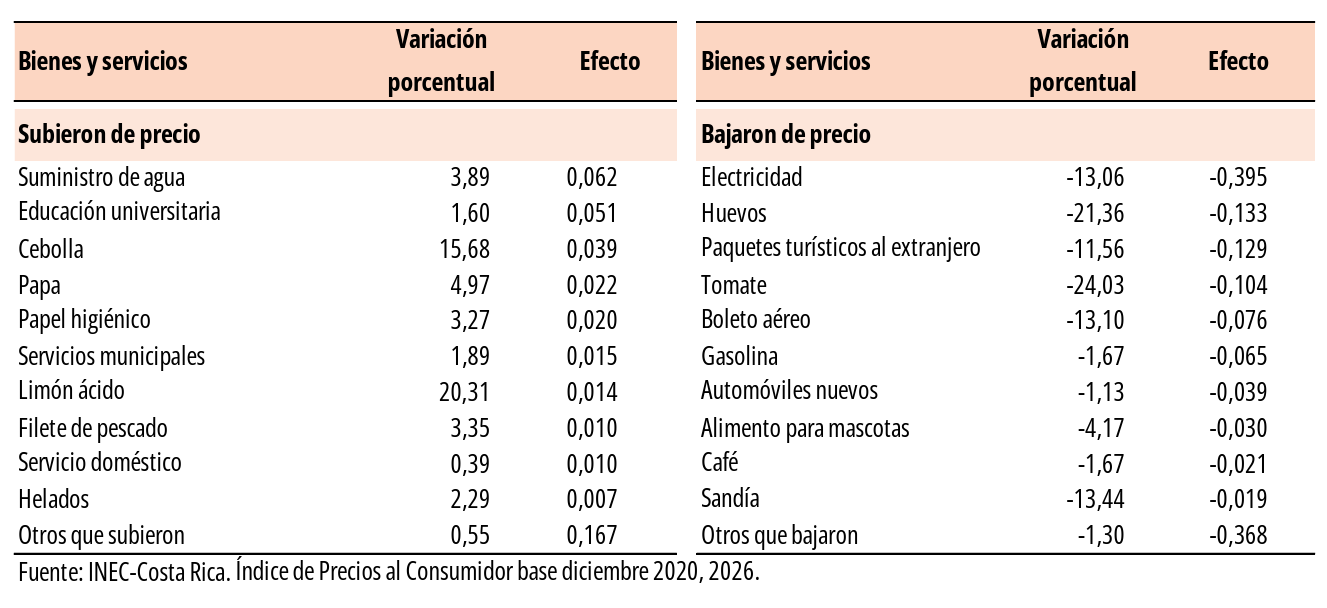 Los bienes y servicios que mostraron mayor efecto al alza en la variación mensual del índice fueron el suministro de agua, la educación universitaria y la cebolla, mientras que los que más influyeron en el efecto a la baja fueron la electricidad, los huevos y los paquetes turísticos al extranjero.