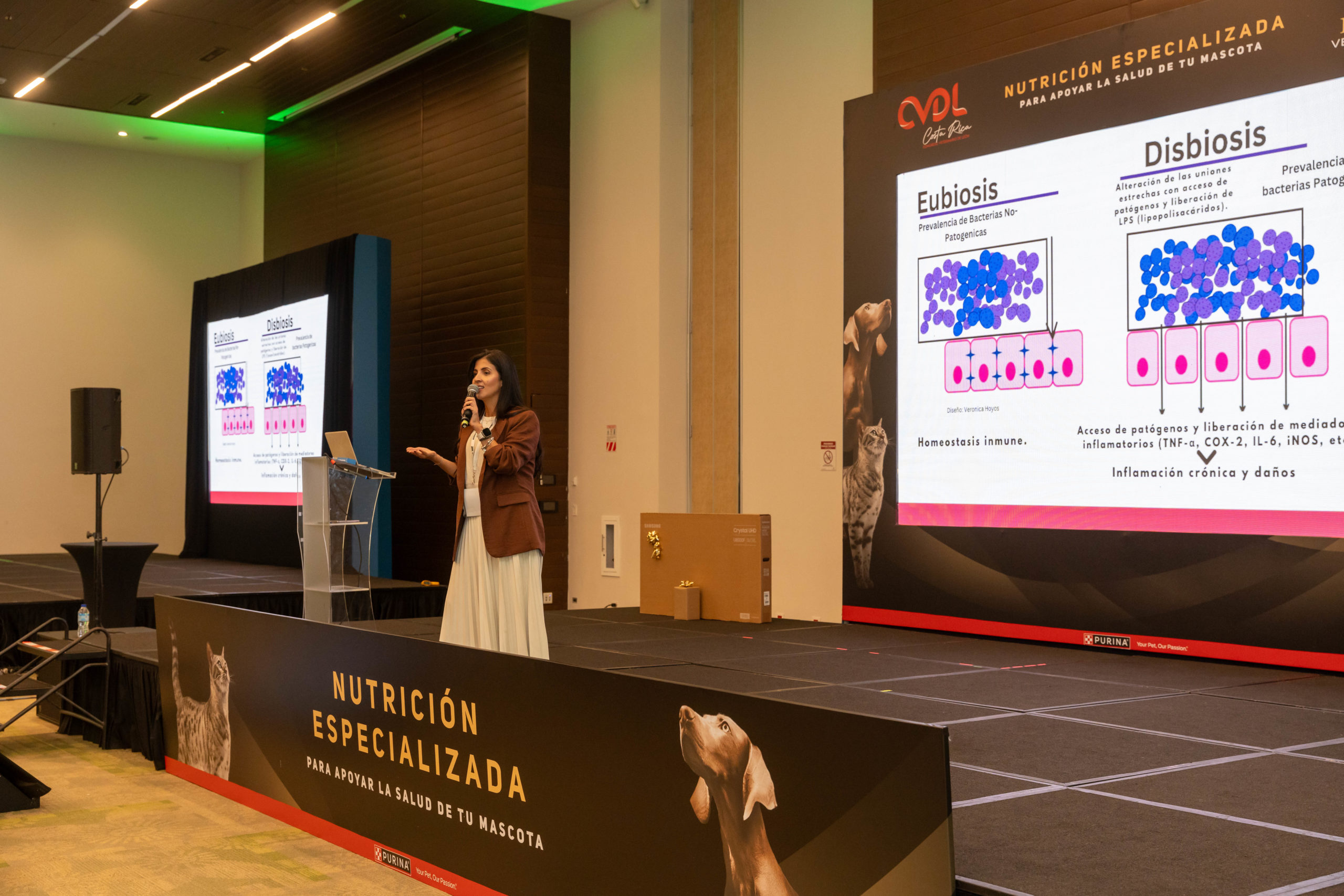 Como parte de su participación, Purina Pro Plan contó con la presencia de la Dra. Verónica Hoyos como conferencista invitada. La especialista, Médica Veterinaria con Maestría en Medicina Interna de Pequeñas Especies y posgrado en cirugía por la UAB (España), es fundadora de la Asociación Colombiana de Gastroenterología Veterinaria y referente en microbiota intestinal y análisis de microbioma en la región.