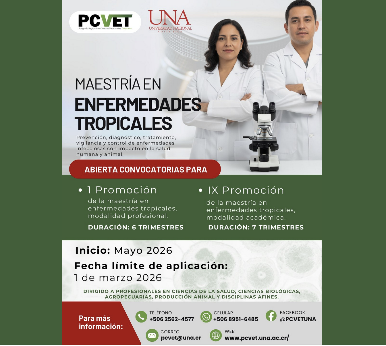 La Escuela de Medicina Veterinaria de la Universidad Nacional (UNA), a través del Posgrado Regional en Ciencias Veterinarias (PCVET), informa que permanece abierta la convocatoria para la Maestría en Enfermedades Tropicales, la cual está dirigida a profesionales de las áreas de salud, ciencias biológicas, agropecuarias, producción animal y disciplinas afines.