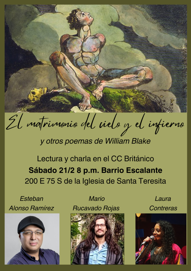 Una nueva traducción de El matrimonio del cielo y el infierno y otros textos de William Blake será presentada este sábado 21 de febrero a las 8:00 p.m. en el Centro Cultural Británico, ubicado en Barrio Escalante, 200 metros este y 75 sur de la iglesia de Santa Teresita.