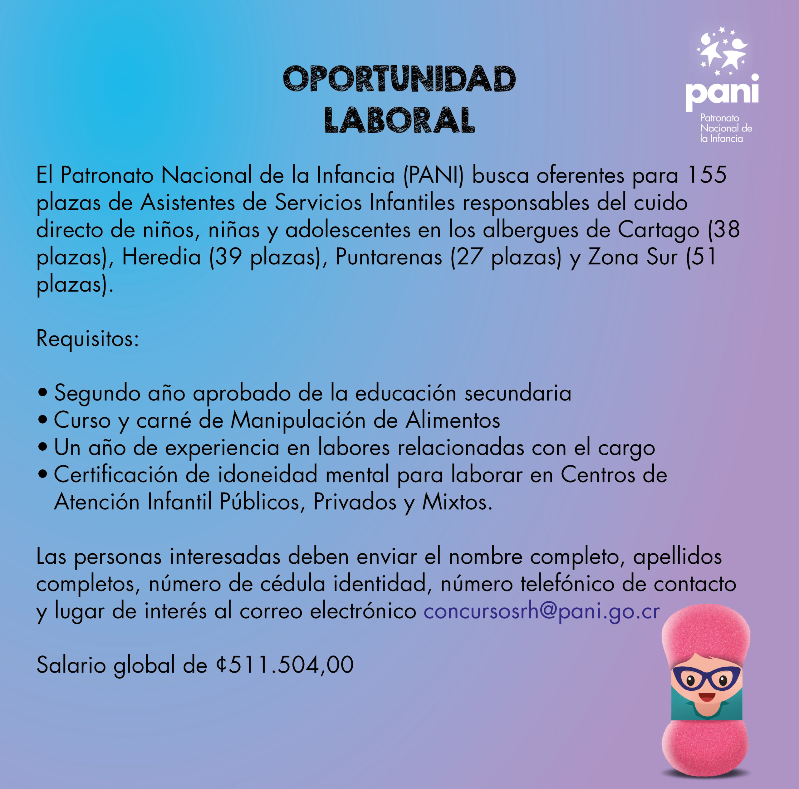 El Patronato Nacional de la Infancia (PANI) anunció la apertura de un proceso de reclutamiento para conformar una base de datos de oferentes interesados en ocupar 155 plazas de asistentes de servicios infantiles, quienes estarán a cargo del cuido directo de niños, niñas y adolescentes en albergues institucionales.