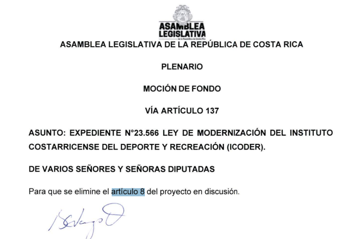 Se trata del expediente 23.566 "Ley de Modernización del Instituto Costarricense del Deporte y Recreación (Icoder)", presentado por la diputada liberacionista Rosaura Méndez Gamboa, y que este mes fue enviado a la Comisión de Asuntos Sociales para tramitar el último paquete de mociones de fondo que fueron presentadas, antes de que el expediente pase a conocimiento del plenario para su discusión y votación en primer debate.
