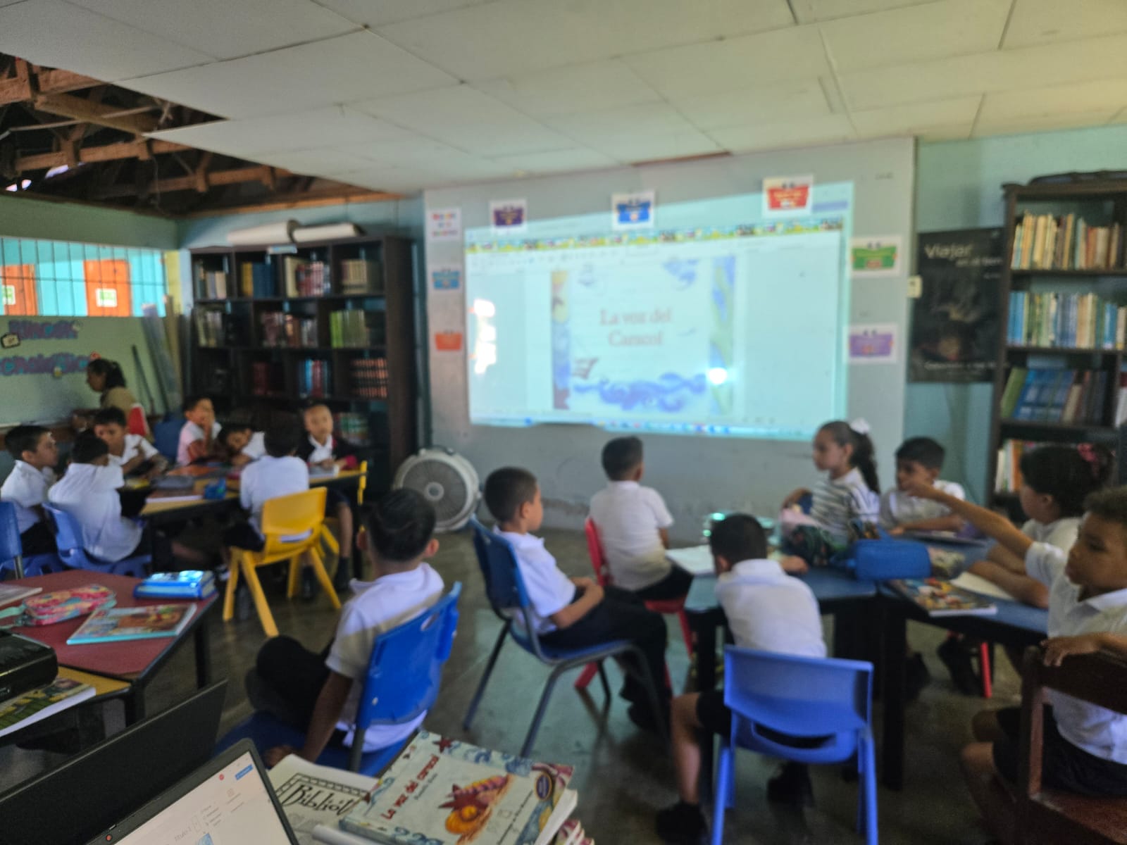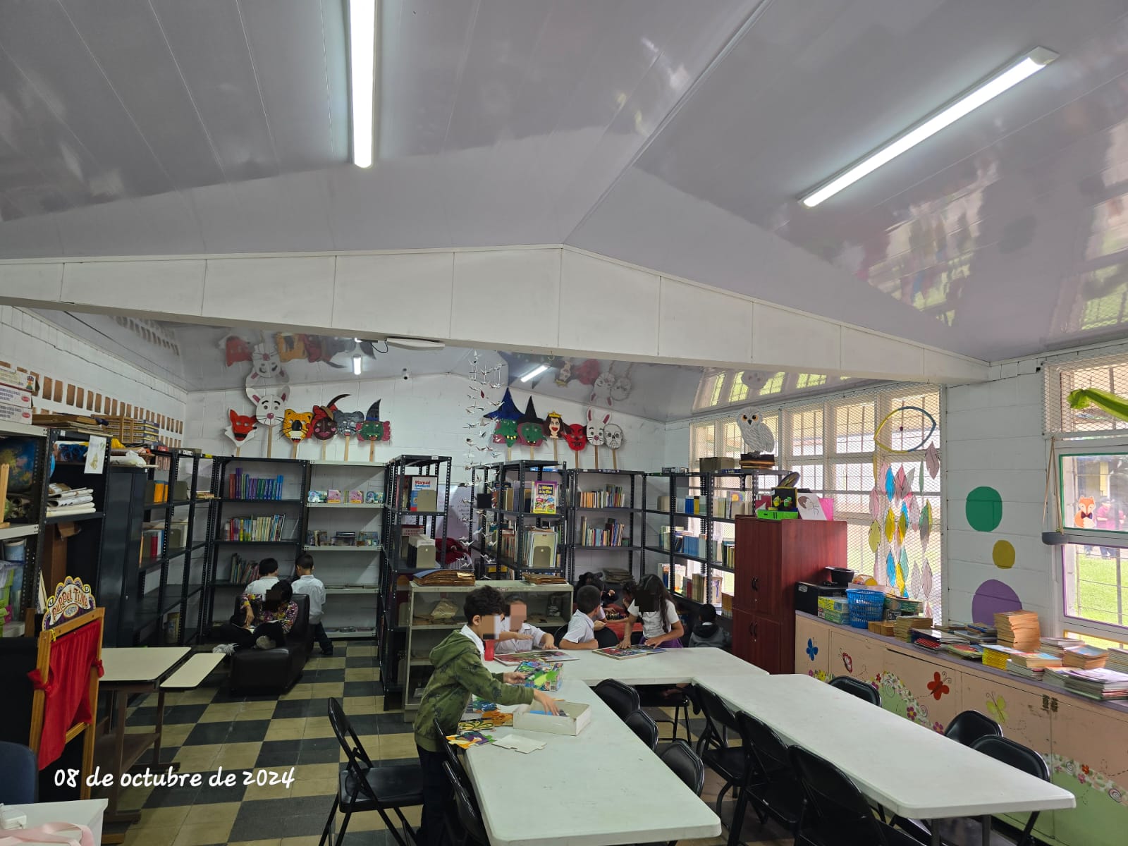 La luz fluorescente y el cielorraso blanco proyectan las siluetas de los estudiantes sentados en las dos mesas largas. Encima de unos estantes pegados en la pared hay unas mascaradas de leyendas costarricenses, elaboradas entre los niños y personal docente. A pesar de tener a su lado un sillón rojo en forma de cubo, algunos están más cómodos tirados en el piso, entretenidos, con libros en sus manos.