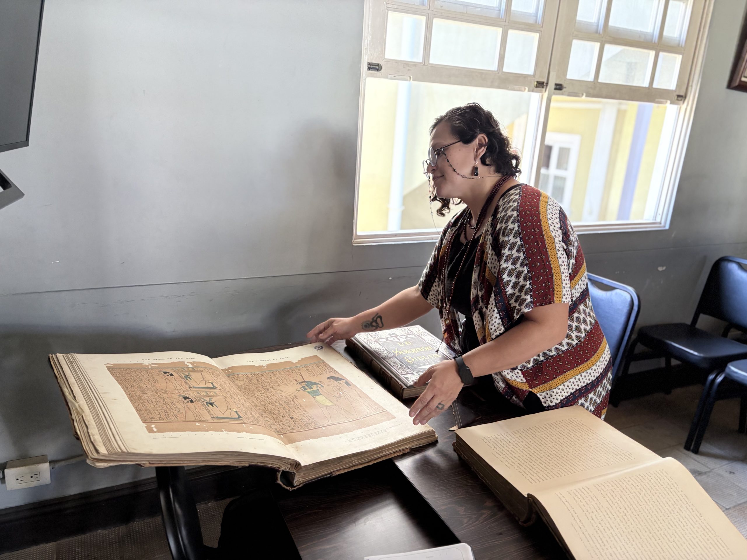 Angie Obaldía, bibliotecóloga del Colegio Superior de Señoritas, muestra una de las joyas del acervo: El Libro de los Muertos, edición del siglo XIX que aún cautiva a quienes lo observan.
