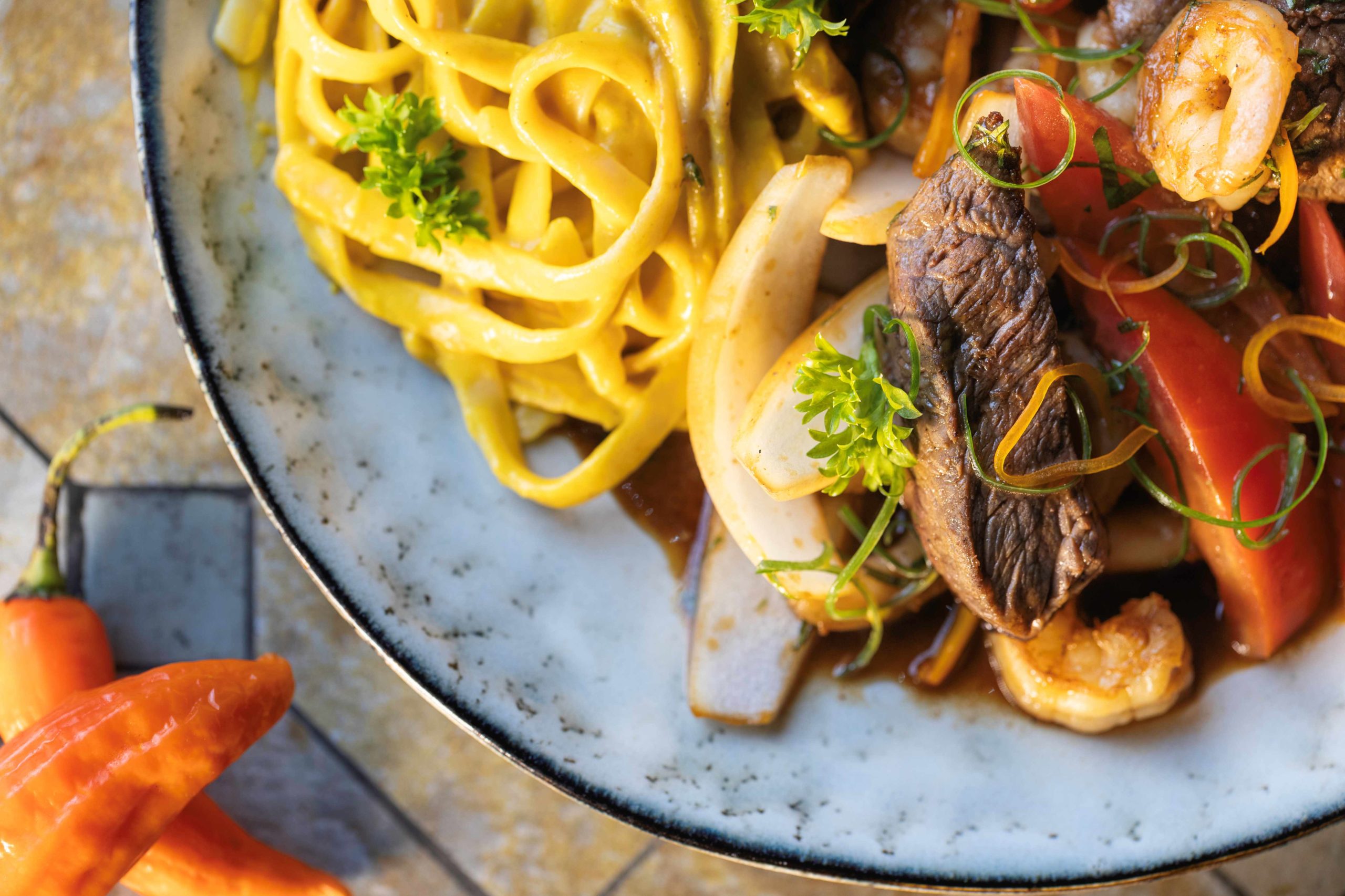 Ingredientes locales frescos, recetas tradicionales peruanas y costarricenses se combinan para una experiencia culinaria única.