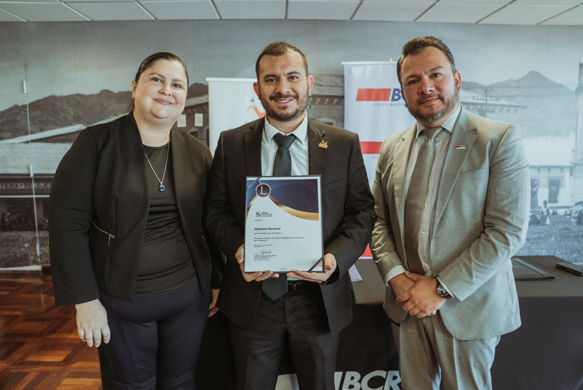 La Imprenta Nacional recibió esta mañana el certificado y la bandera que la acredita como una Entidad Libre de Efectivo, luego de aprobar los lineamientos del Programa L del Banco Central de Costa Rica (BCCR) y en el cual contó con la asesoría del Banco de Costa Rica (BCR).