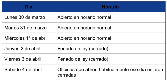 En el caso de las oficinas que usualmente abren los sábados, permanecerán cerradas el sábado 4 de abril. El banco y sus subsidiarias retomará su horario habitual de atención a partir del lunes 6 de abril.