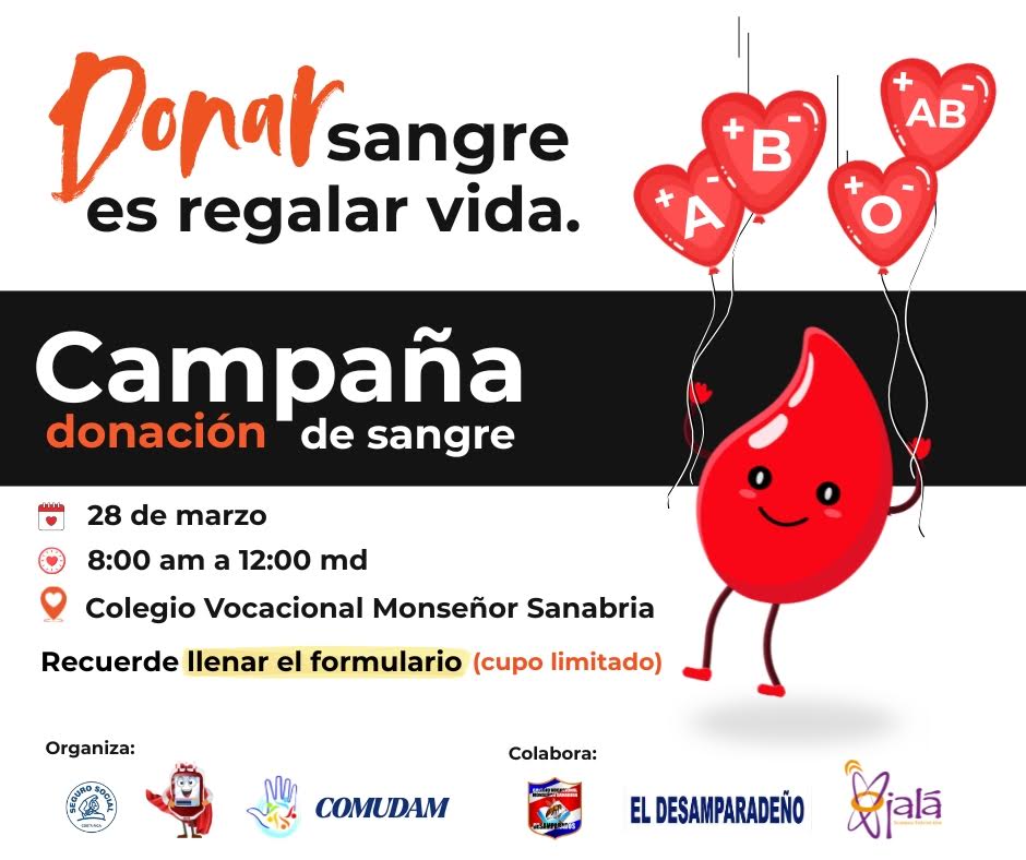 El cantón central de Desamparados será sede de la Feria y Jornada de Donación de Sangre el próximo 28 de marzo, en el Colegio Vocacional Monseñor Sanabria (COVOSA), como parte de un esfuerzo conjunto entre la Asociación Desampa Inclusivo, la Caja Costarricense de Seguro Social (CCSS) y la Comisión Municipal de Discapacidad y de la Persona Adulta Mayor de Desamparados (COMUDAM).