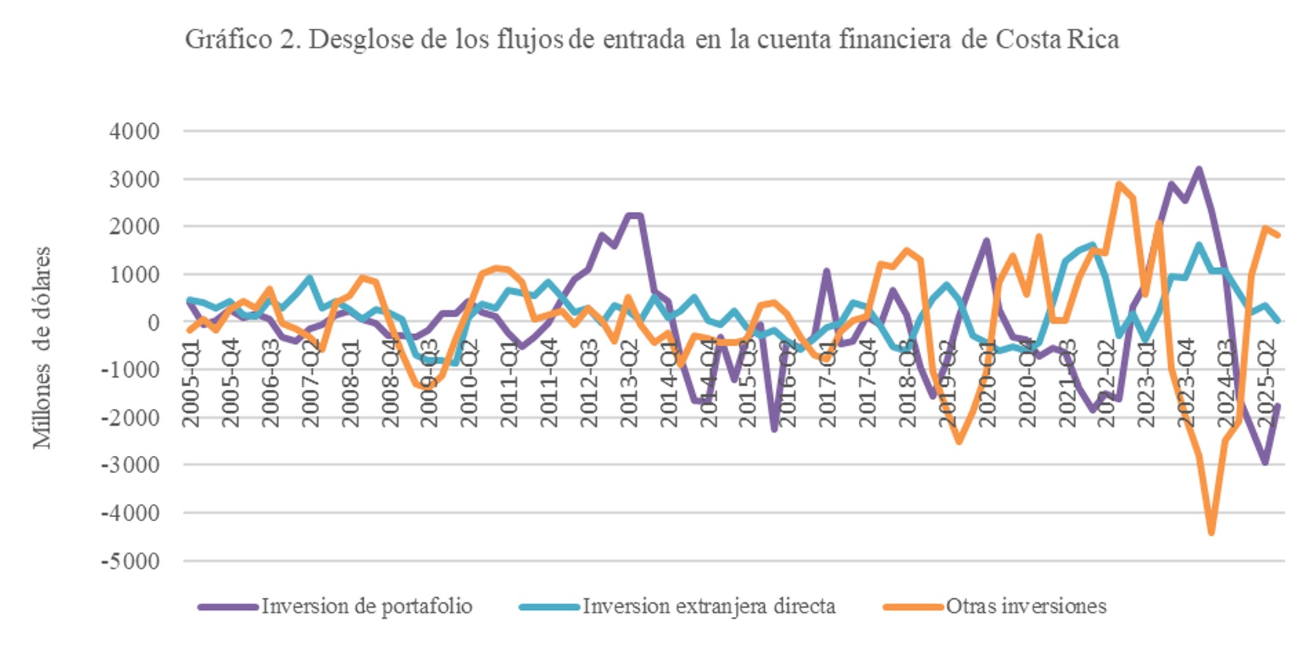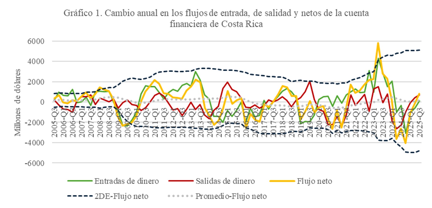 Eso es, precisamente, lo que sugiere el gráfico siguiente. La línea roja representa los movimientos de los residentes: cuando sube, indica que costarricenses trajeron al país recursos que tenían en el exterior; cuando baja, que aumentaron sus inversiones fuera del país. La línea verde refleja los movimientos de los no residentes: si sube, significa que personas o empresas extranjeras trajeron recursos a Costa Rica; si baja, que retiraron capital o dejaron de traerlo. La línea amarilla muestra el flujo neto. No existe un umbral exacto a partir del cual pueda hablarse de una subida o una caída abrupta de los flujos financieros, pero la literatura suele usar como referencia las líneas azules punteadas a ambos lados del cero (formalmente, dos desviaciones estándar por encima o por debajo del promedio). Todo esto puede parecer tedioso, pero el gráfico busca mostrar una sola cosa: en 2023 hubo un salto abrupto en los flujos netos de dinero hacia Costa Rica, explicado sobre todo por la entrada de capital extranjero.