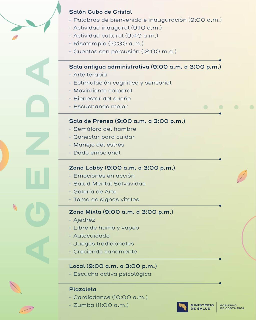 Durante el evento se realizarán múltiples espacios participativos, entre ellos sesiones de risoterapia, cuentos con percusión, arte terapia, estimulación cognitiva, actividades relacionadas con el bienestar del sueño, una galería de arte y toma de signos vitales.