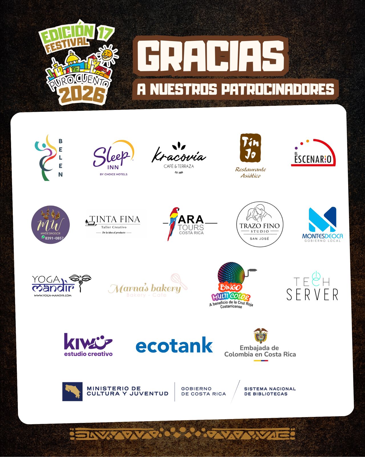 Esta es una iniciativa independiente que cuenta con el apoyo de: Municipalidad de Belén, Bingo Multicolor, Municipalidad de Montes de Oca, Sistema Nacional de Bibliotecas del Ministerio de Cultura y Juventud, Embajada de Colombia, Sleep Inn Hotel, Yoga Mandir, Restaurante Tin Jo, Café Kracovia, Teatro El Escenario, Kiwü Estudio Creativo, La Casa del Tanque, Trazo Fino Studio, Marna's Bakery, Tinta Fina Taller Creativo, AraTours, Tech Server y MW Desings CR.