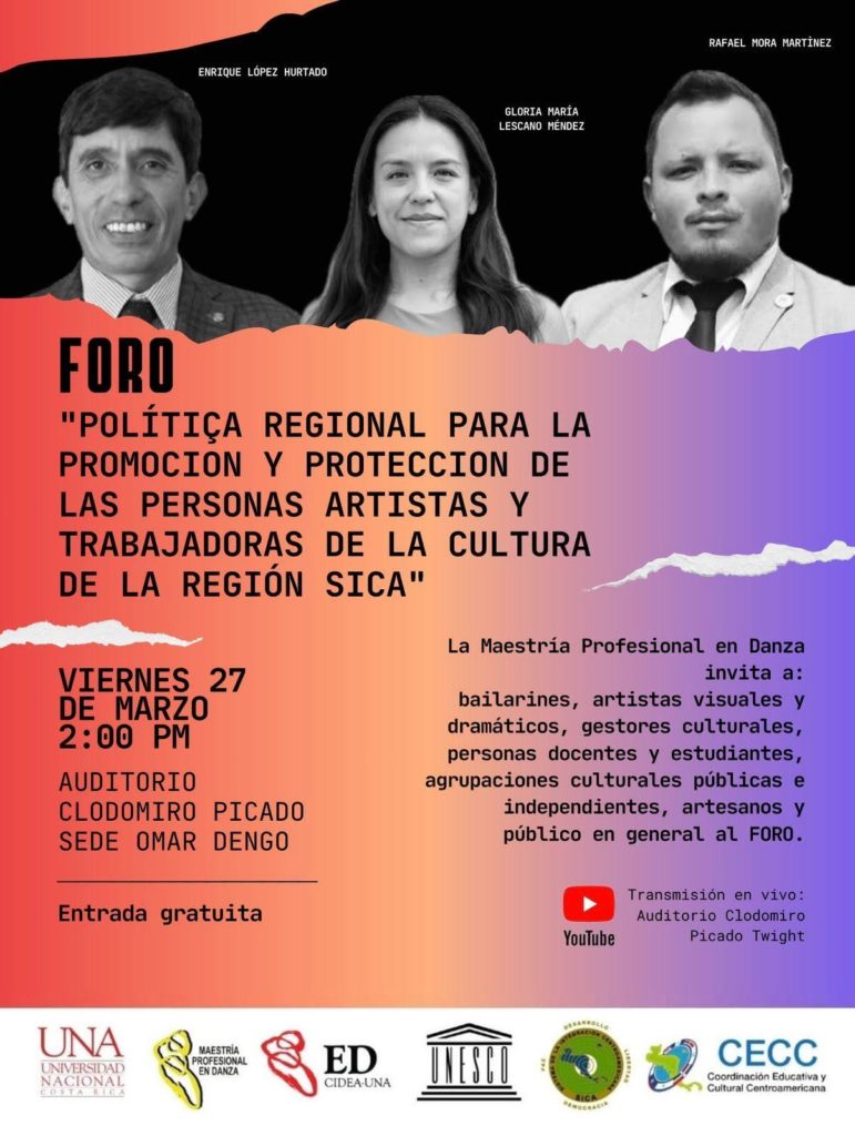 La Universidad Nacional (UNA) será sede de un foro académico en el que se analizará la Política Regional para la Promoción y Protección de las Personas Artistas y Trabajadoras de la Cultura (PCDA) SICA al 2030, una iniciativa que plantea reconocer el arte como trabajo con valor social, económico y derechos laborales.