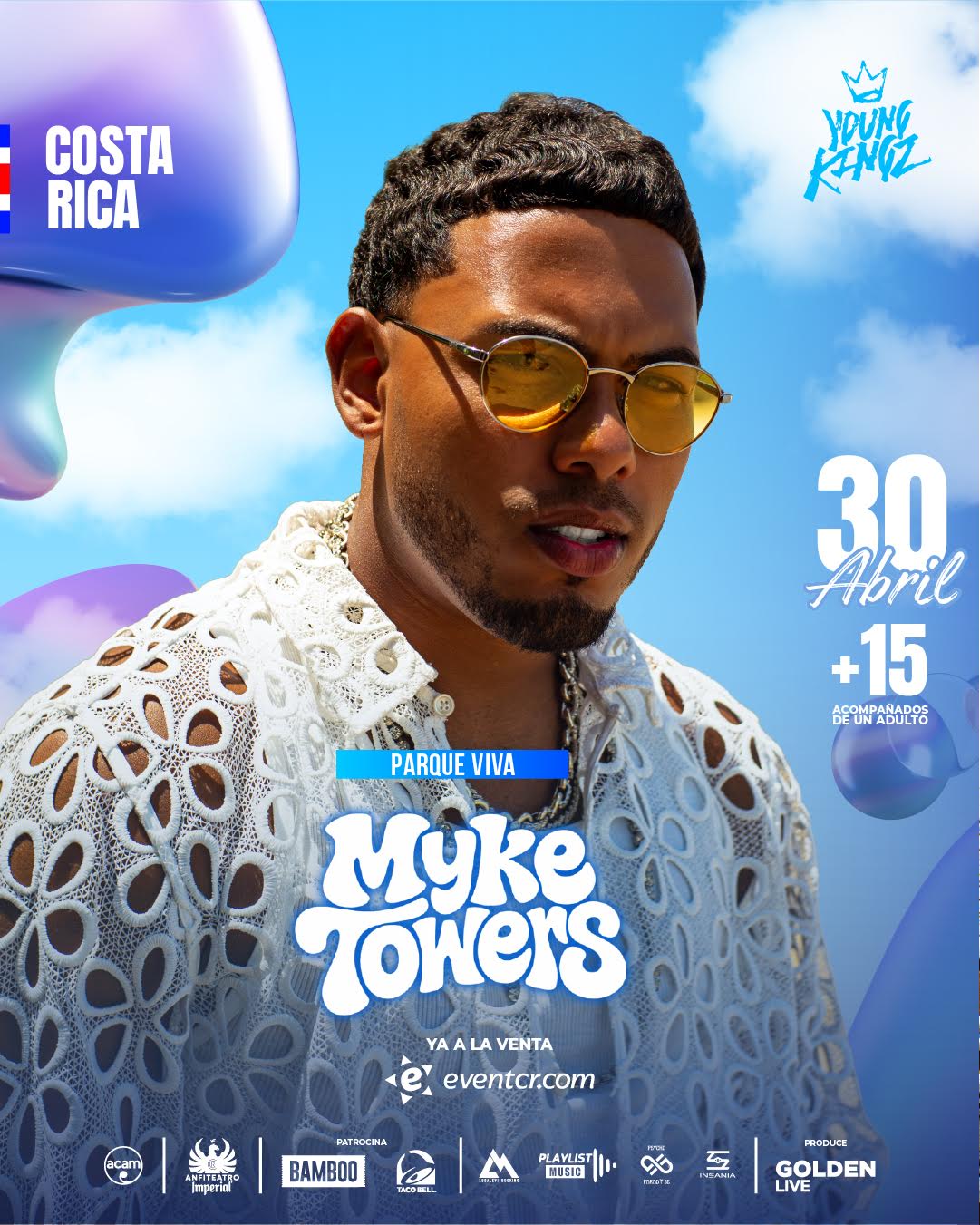 La productora Golden Live anunció el concierto del artista urbano Myke Towers en Costa Rica, programado para el próximo 30 de abril en Parque Viva.