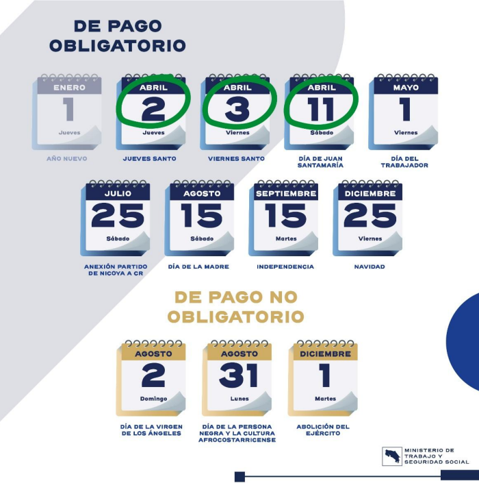 En las próximas dos semanas, Costa Rica tendrá tres días feriados de pago obligatorio, de acuerdo con lo establecido en el artículo 148 del Código de Trabajo. Se trata del Jueves y Viernes Santos —2 y 3 de abril, respectivamente— y el sábado 11 de abril, fecha en que se conmemora la gesta heroica de Juan Santamaría.