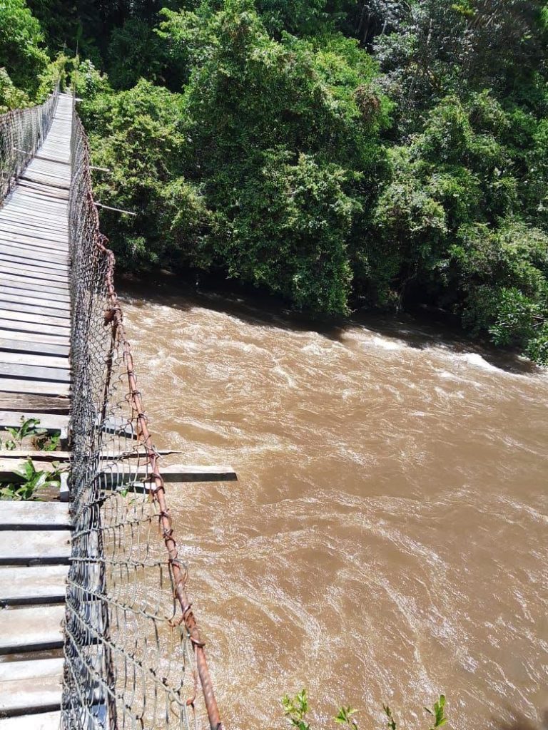 Durante la visita se identificó un puente peatonal sobre el río Telire, de aproximadamente 70 metros de largo y 1,2 metros de ancho, que presenta un estado de deterioro avanzado.
