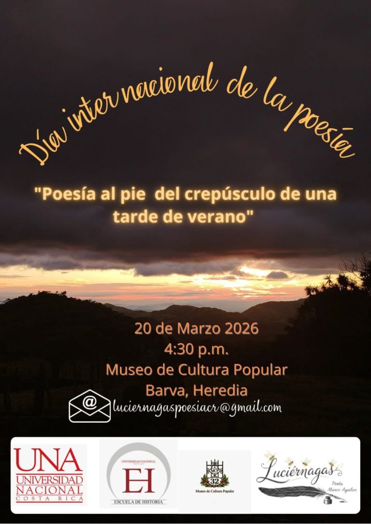 El Museo de Cultura Popular de la Universidad Nacional (UNA), en coordinación con la Escuela de Poesía Proyecto Luciérnagas Poeta Marco Aguilar, organizará durante marzo una serie de actividades para celebrar el Mes de la Poesía en conmemoración del Día Internacional de la Poesía, que se celebra el 21 de marzo.