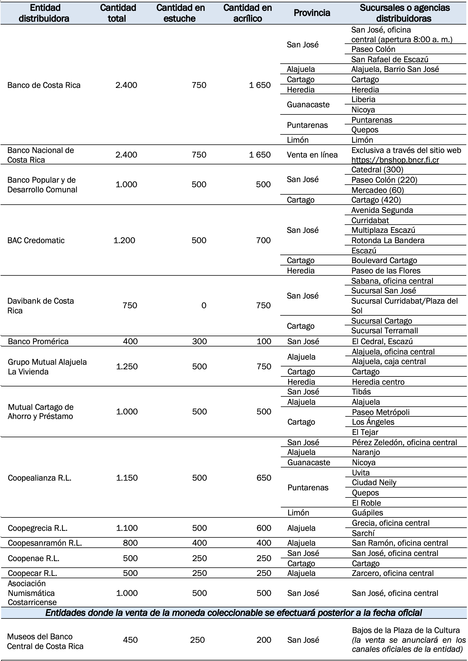 El BCCR puntualizó que la cantidad de monedas coleccionables asignadas a cada entidad financiera se determina según sus requerimientos. Además, son estas mismas entidades las que definen los puntos de venta donde la moneda estará disponible para el público, así como la cantidad de monedas por presentación en cada ubicación.