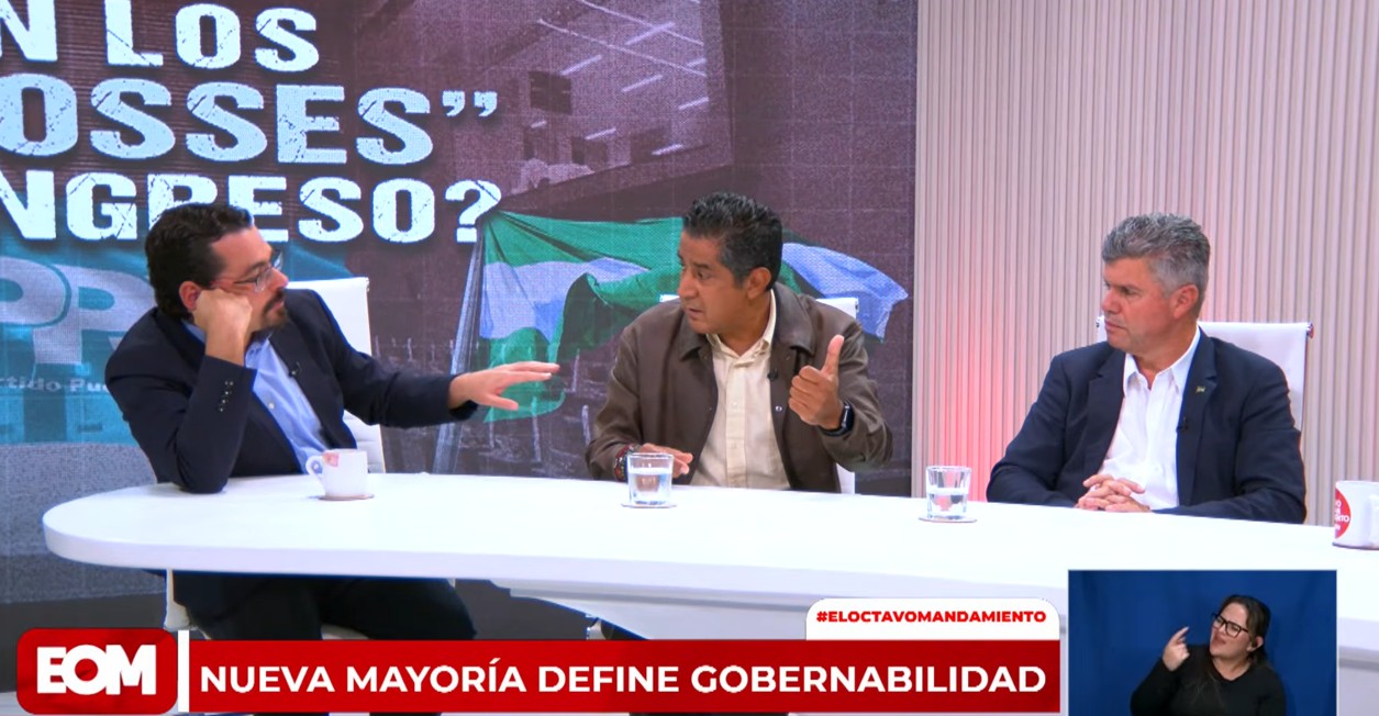 José María Villalta, Nogui Acosta y Álvaro Ramírez durante la entrevista en El Octavo Mandamiento: -Acosta: "No, yo no cuestiono que los diputados nombren", -Villalta: "A mí me parece muy conveniente esa postura porque ustedes tienen mayoría en la asamblea" (1:41:45-1:41:54).
