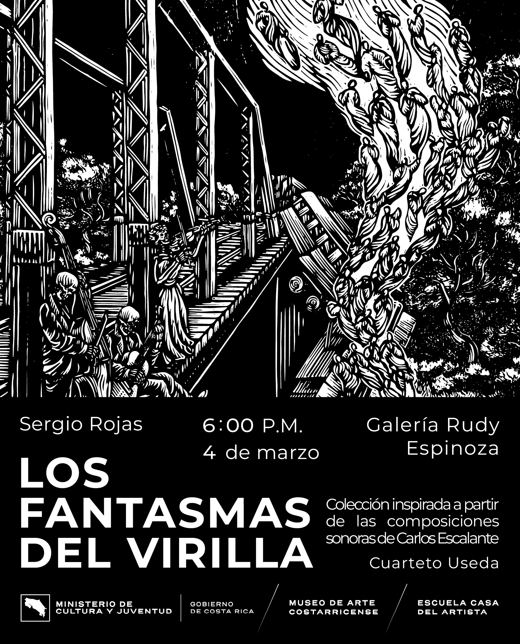El grabador y muralista costarricense Sergio Rojas inaugura el próximo 4 de marzo a las 6 p.m. su exposición Los Fantasmas del Virilla en la Galería Rudy Espinoza. La muestra permanecerá abierta al público durante un mes.