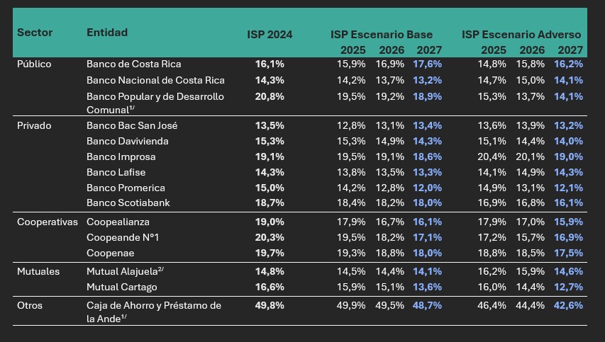 Ante el escenario adverso hipotético, los resultados indican que el que las entidades participantes cuentan con capacidad para resistir una desaceleración económica severa ya que, tanto las entidades denominadas sistémicas (para este ejercicio: BNCR, BCR, Popular y Bac San José) como el resto de las entidades presentan niveles de ISP por encima del mínimo regulatorio en sus proyecciones de los años 2026 y 2027.