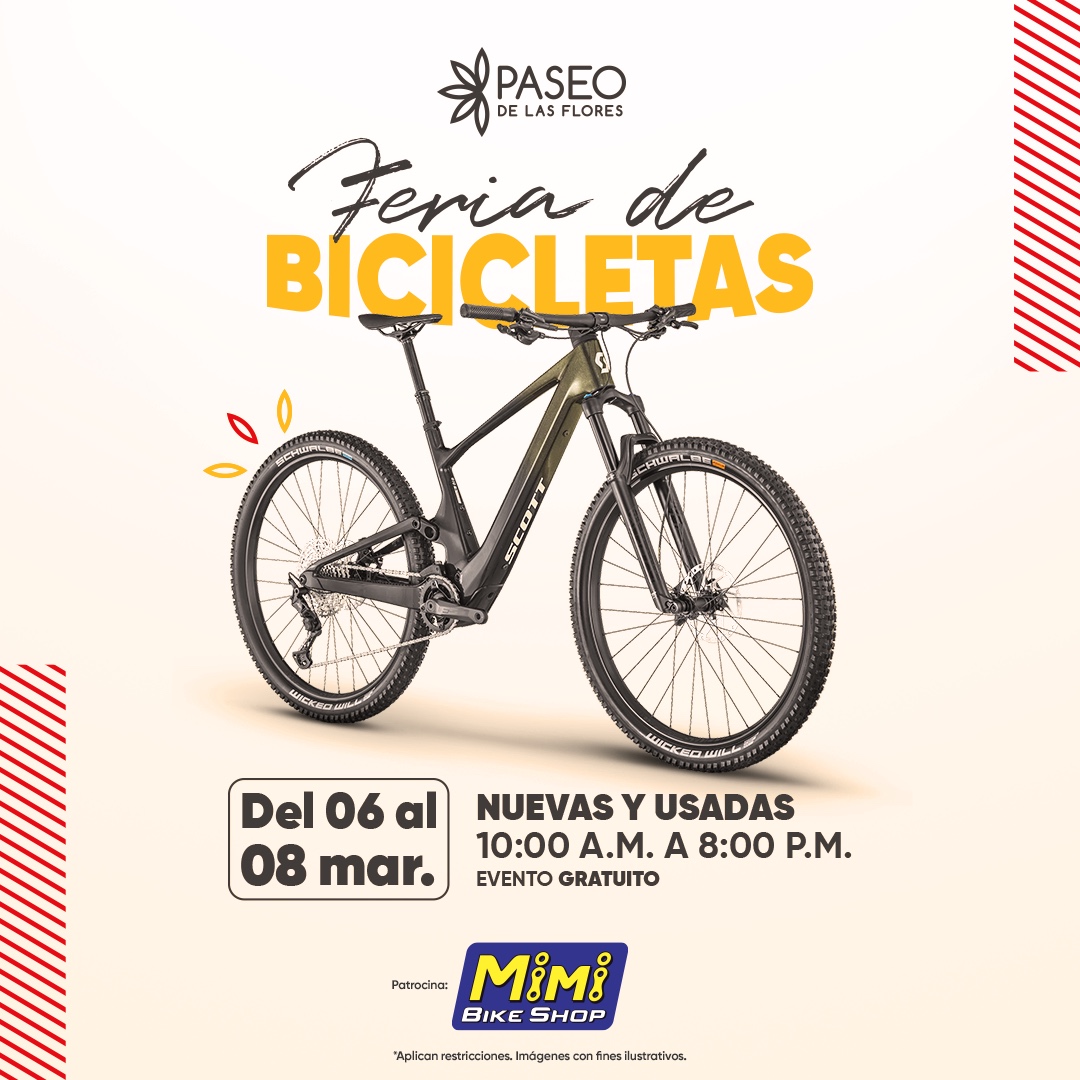 El centro comercial Paseo de las Flores será sede de la Feria de Bicicletas, un evento gratuito que se realizará del 6 al 8 de marzo, de 10:00 a.m. a 8:00 p.m., y que reunirá una variada oferta de bicicletas nuevas y usadas para distintos perfiles de usuarios.