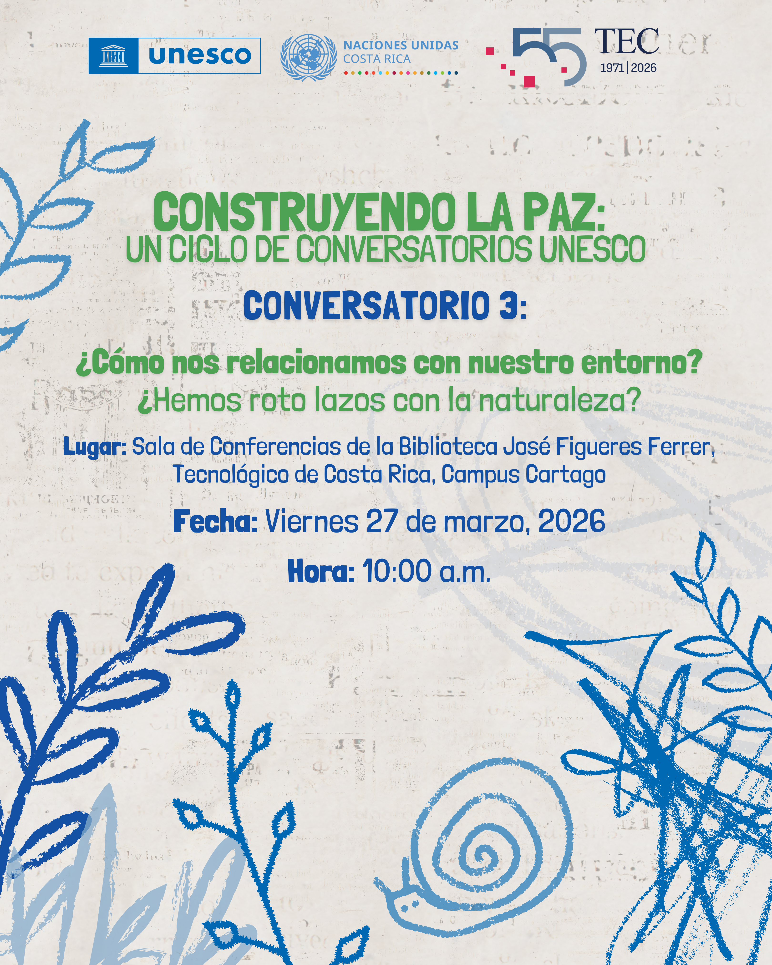 El conversatorio, titulado “¿Cómo nos relacionamos con nuestro entorno? ¿Hemos roto lazos con la naturaleza?”, tendrá lugar el viernes 27 de marzo en la Sala de Conferencias de la Biblioteca José Figueres Ferrer en el Campus Tecnológico Central, a las 10:00 am, como parte de la conmemoración del 55 aniversario del TEC, institución académica clave para el desarrollo científico y tecnológico del país.