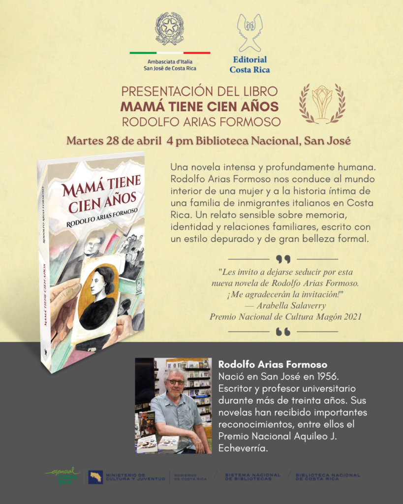 Invitan: Ministerio de Cultura y Juventud, Benemérita Biblioteca Nacional del SINABI, Editorial Costa Rica y Embajada de Italia en Costa Rica.