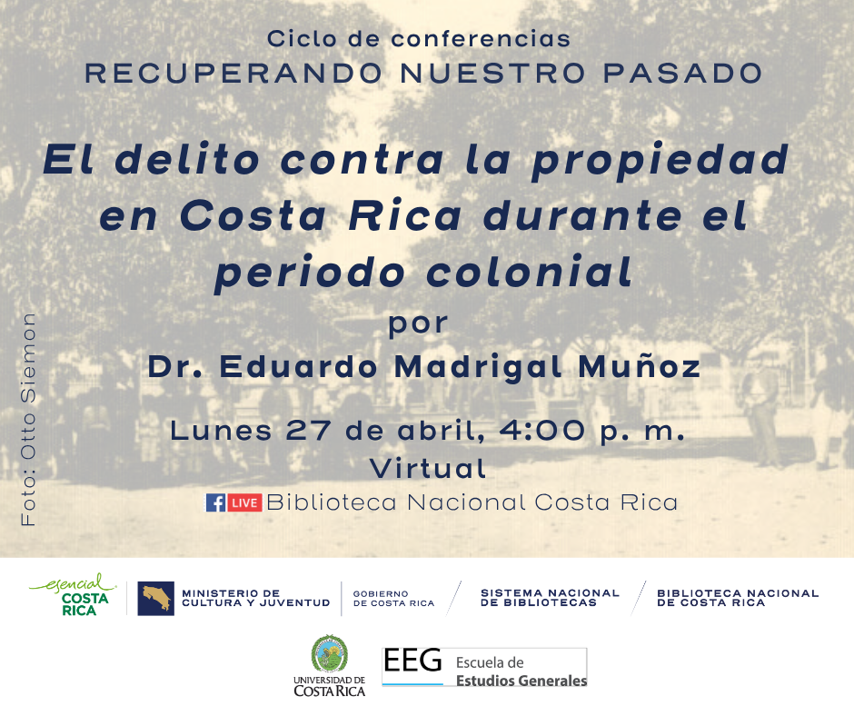 El Dr. Eduardo Madrigal Muñoz impartirá una charla académica sobre el análisis histórico del delito contra la propiedad en Costa Rica durante la época colonial, como parte del ciclo Recuperando nuestro pasado.