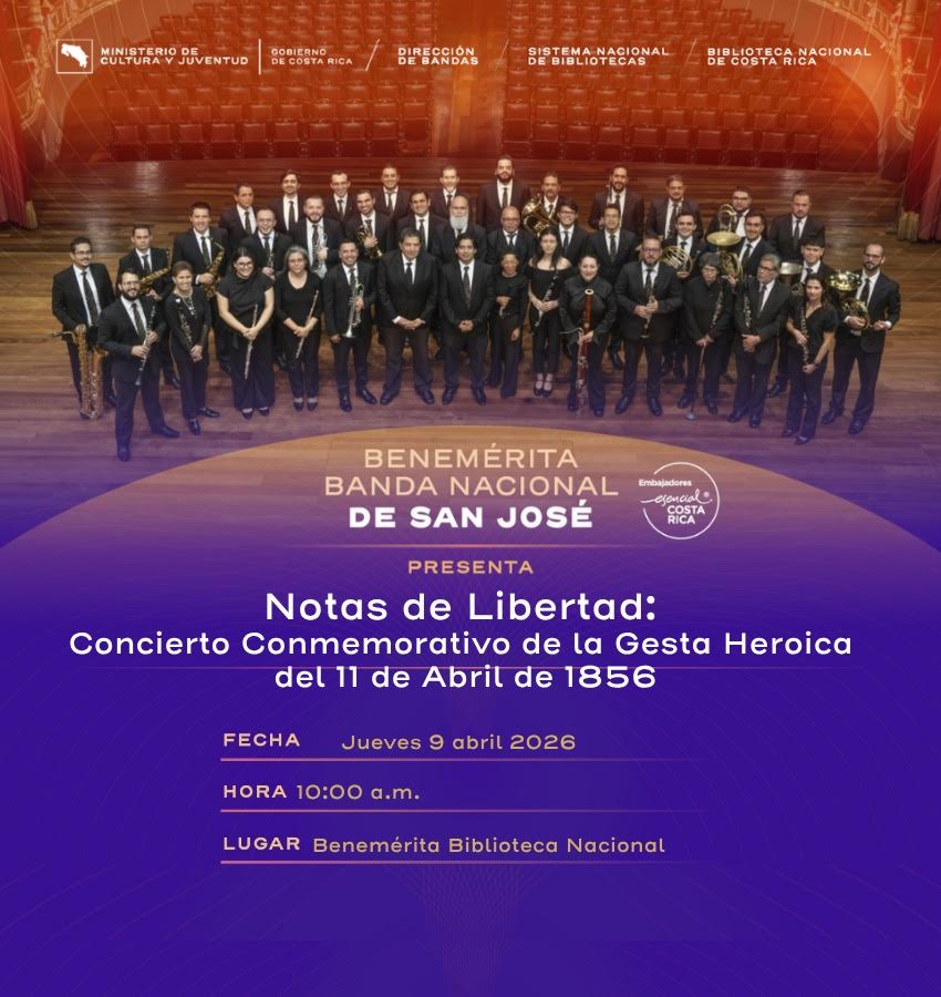 Invitan: Ministerio de Cultura y Juventud, Benemérita Biblioteca Nacional del SINABI y Benemérita Banda Nacional de San José.