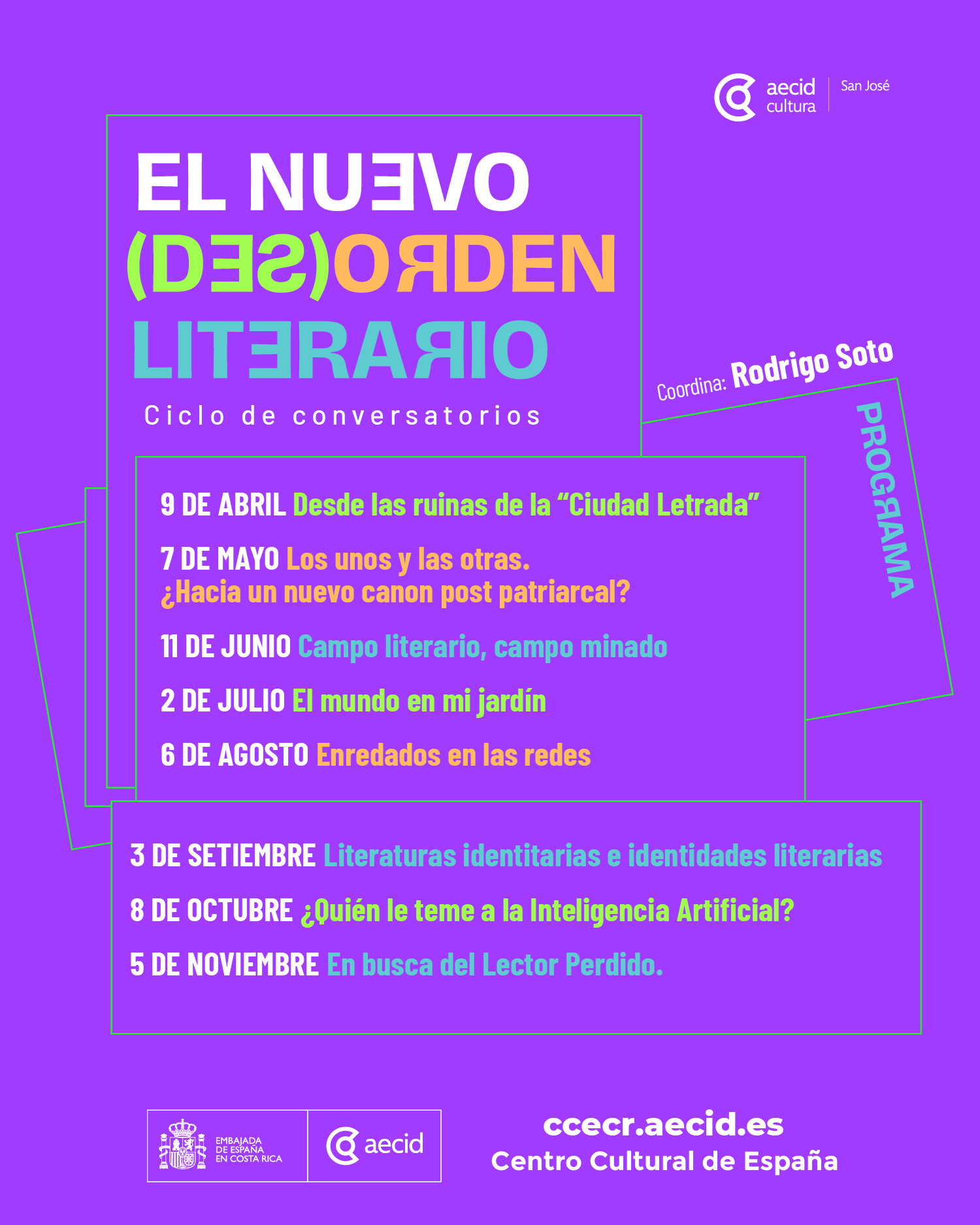 El Centro Cultural de España en Costa Rica presentará el ciclo de conversatorios El nuevo (des)orden literario, una propuesta coordinada por Rodrigo Soto que busca abrir un espacio de reflexión sobre las transformaciones actuales del campo literario en un contexto de cambio constante.