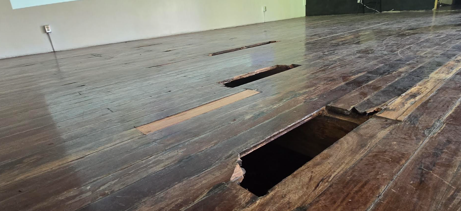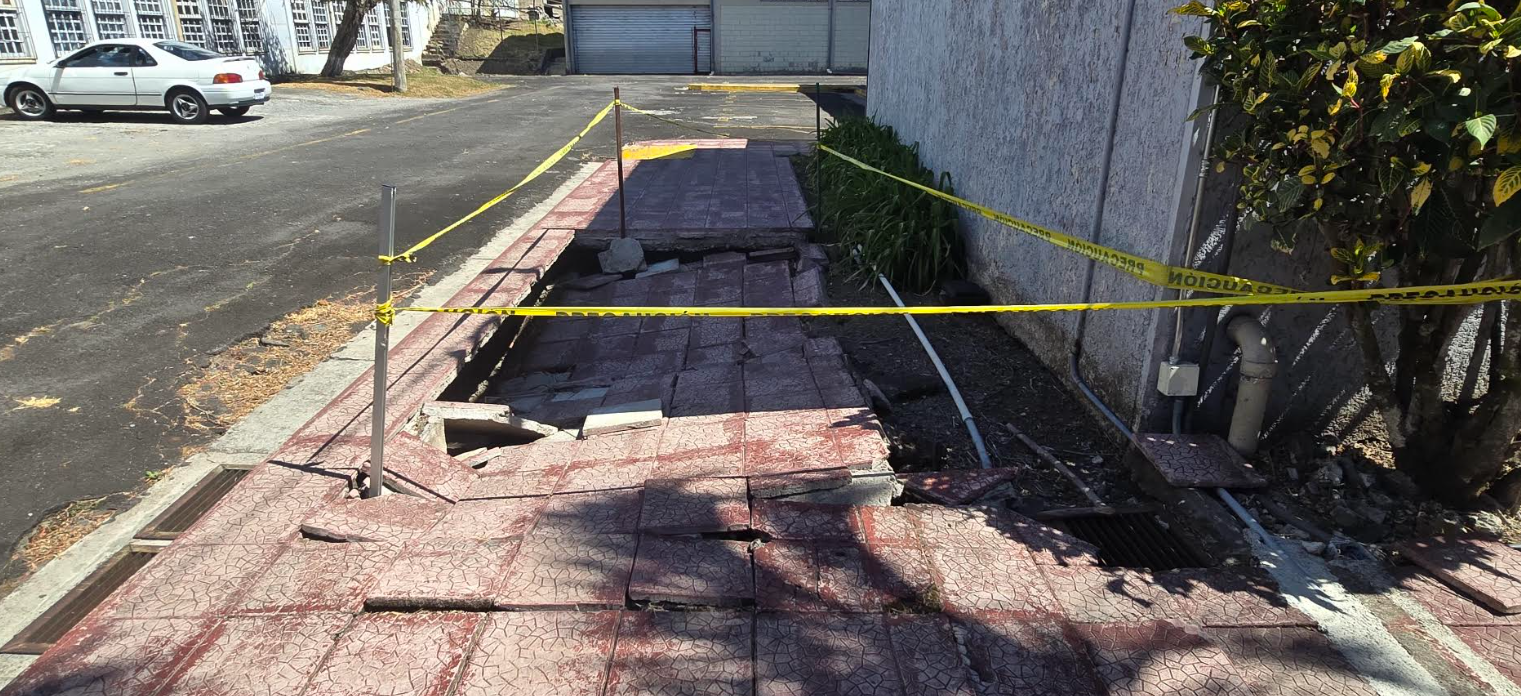 Durante la visita se identificó que el piso de madera presenta deformaciones y flexión al tránsito de las personas, lo que genera una sensación de inestabilidad y compromete la seguridad de la población estudiantil. Según la información recopilada, el año pasado se registró un accidente con personal docente. Además, se observaron agrietamientos en paredes, ventanas en estado ruinoso, daños en cielos rasos, así como un sótano que incumple la Ley 7600. También se reportó un socavamiento al costado este de la edificación.