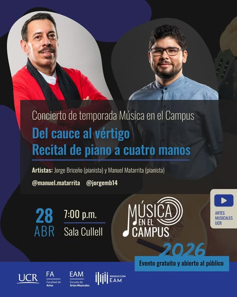 Los pianistas costarricenses Jorge Briceño González y Manuel Matarrita Venegas presentarán la gira Del cauce al vértigo, un programa para piano a cuatro manos que integra obras del repertorio internacional junto a estrenos nacionales y un estreno mundial.