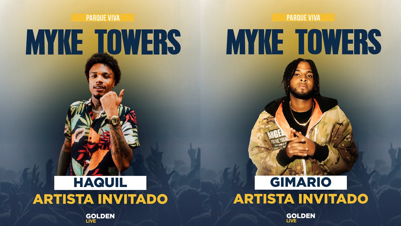 GOLDEN LIVE cree profundamente que Myke es una referencia e inspiración para nuestros artistas por lo cual la productora se siente muy feliz de apoyar a nuestro talento tico, nos complace anunciar a Gimario y Haquil quienes vienen trabajando muy fuertemente sus carreras, con canciones que se han colocado en los primeros lugares de los charts radiales y digitales, serán los artistas que compartirán tarima con Myke Towers en este gran show.