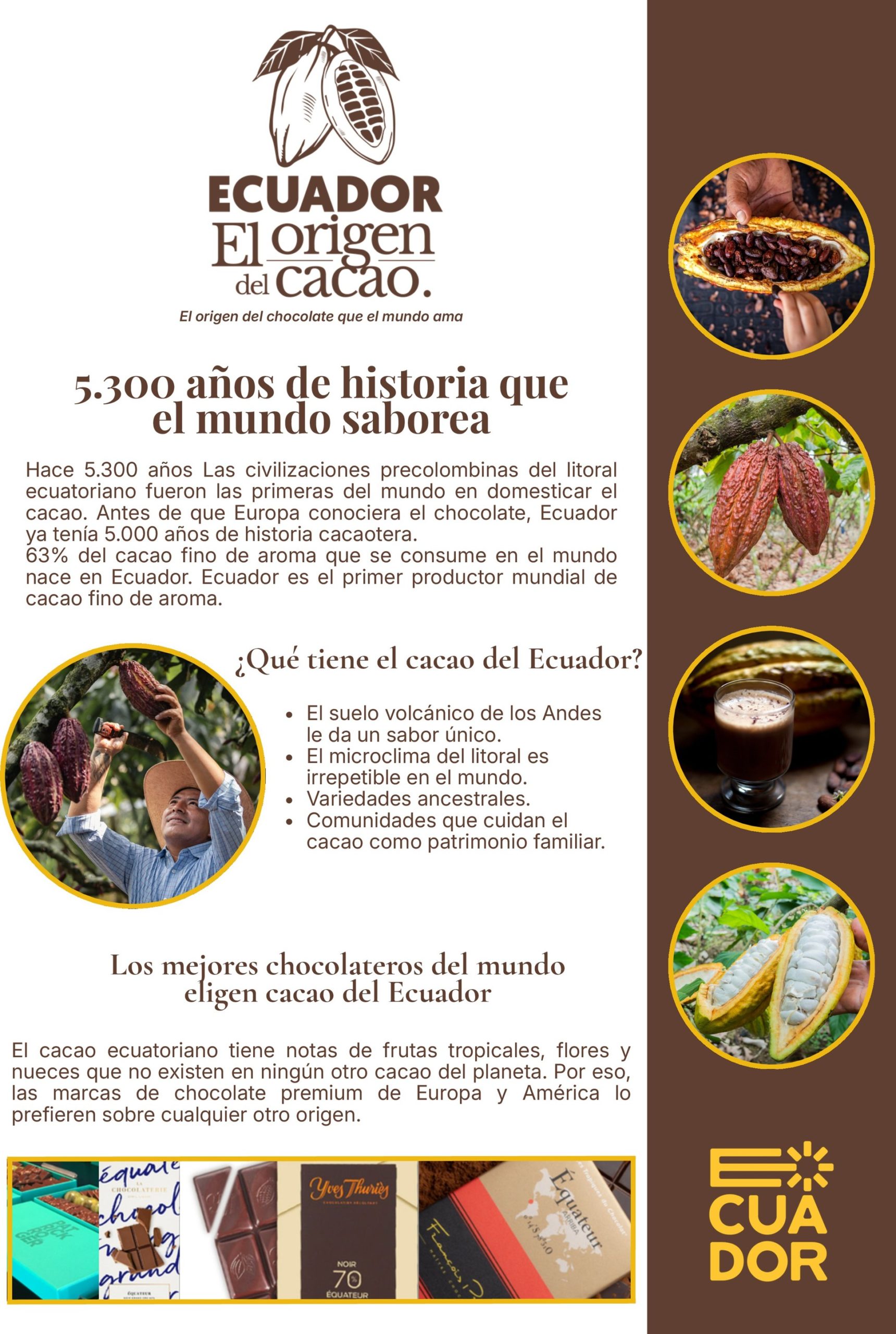 Ecuador no heredó la tradición del cacao, la inventó. Cinco mil trescientos años de historia hacen de nuestro cacao un patrimonio de la humanidad. Y hoy estamos muy orgullosos de compartir nuestra historia con el pueblo costarricense.