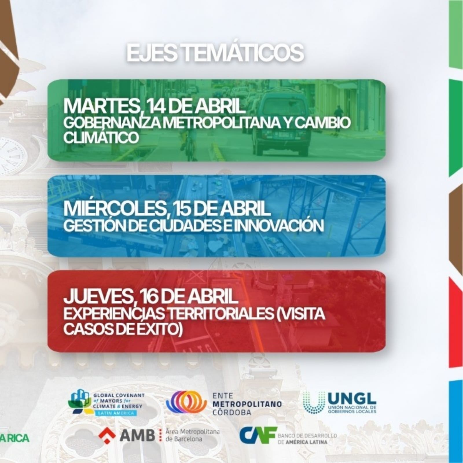 - Co-organiza: Unión Nacional de Gobiernos Locales (UNGL), Ente Metropolitano de Córdoba y Área Metropolitana de Barcelona (AMB).