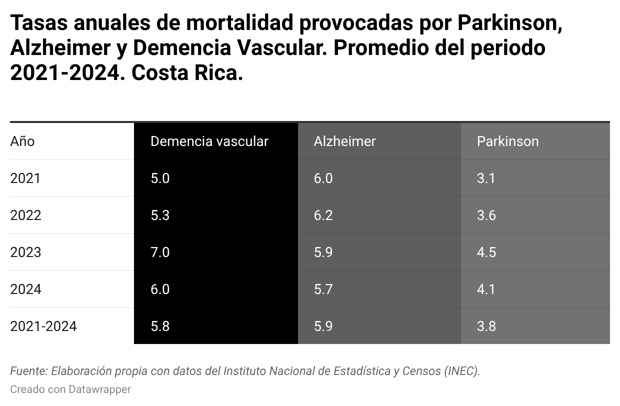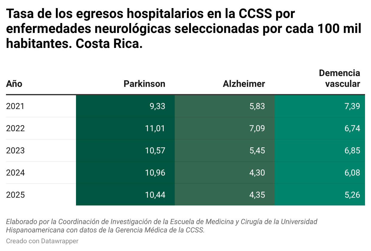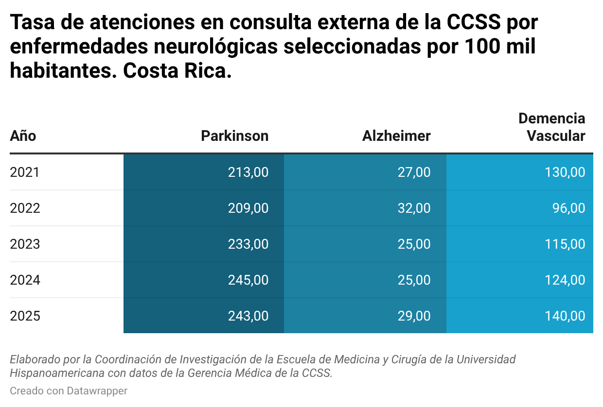 Según datos del Informe en Salud en Perspectiva N.º 47 de la Coordinación de Investigación de la Escuela de Medicina y Cirugía de la Universidad Hispanoamericana, la intensidad de la demanda se vio reflejada en el aumento de la tasa, que pasó entre 2021 y 2025 de 213 a 243 atenciones por cada 100.000 habitantes, consolidándose en el primer lugar entre estas tres enfermedades neurológicas.