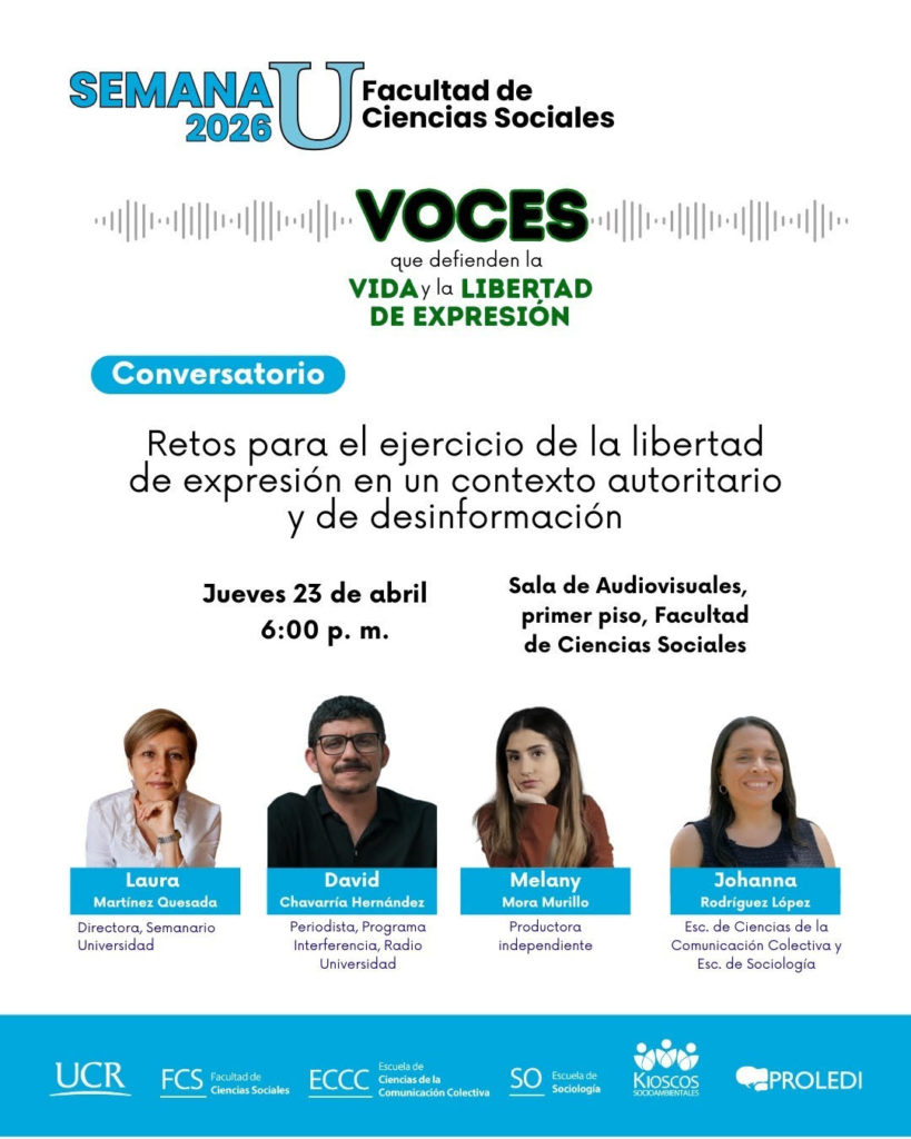 La Universidad de Costa Rica (UCR), a través del Programa de Libertad de Expresión y Derecho a la Información (PROLEDI), realizará una serie de actividades en el marco de la Semana U 2026 de la Facultad de Ciencias Sociales, bajo el eje “Voces que defienden la vida y la libertad de expresión”.