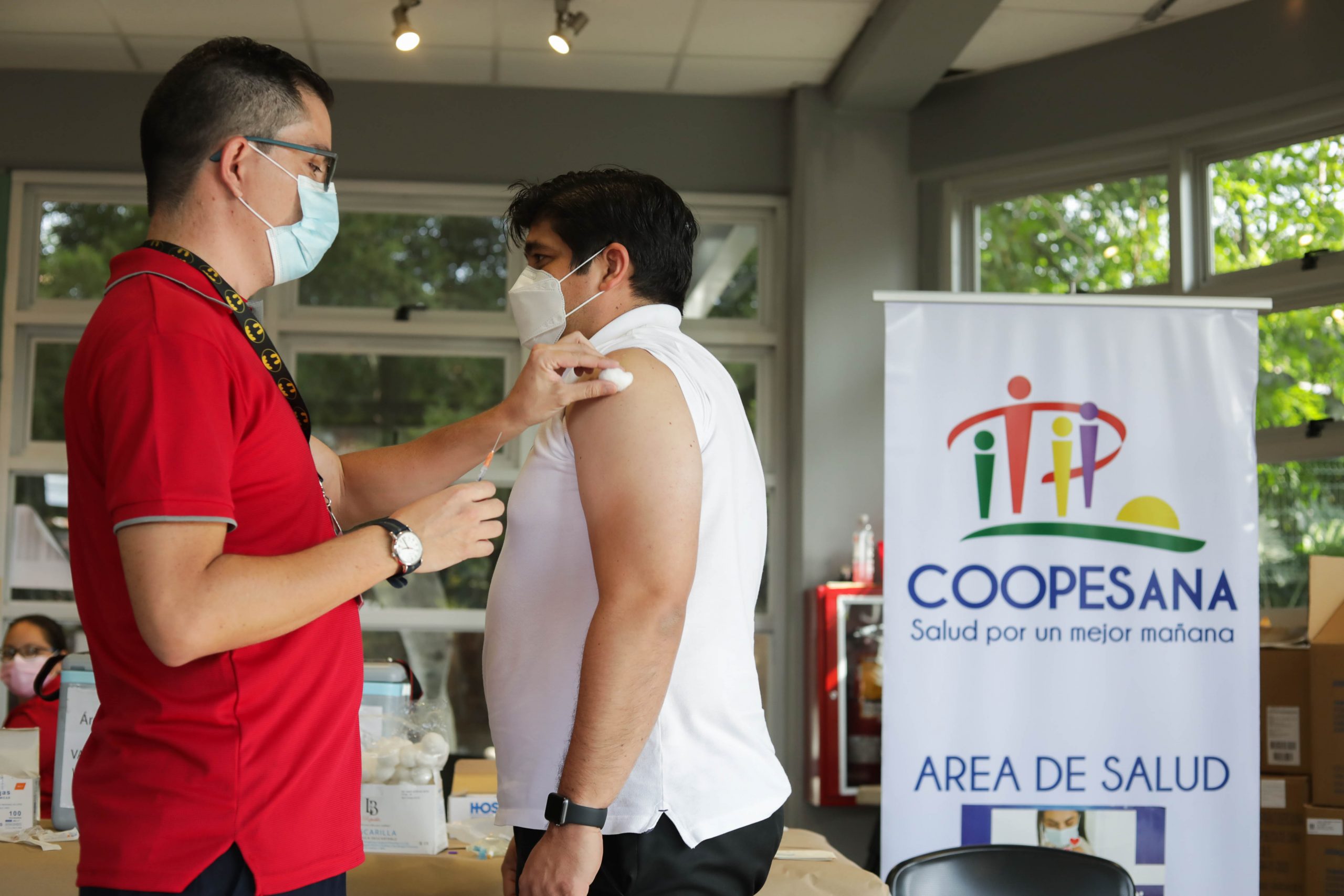 Alvarado de 41 años de edad y Dobles de 40, recibieron el biológico de Pfizer-BioNTech por personal de la cooperativa de salud COOPESANA R.L, que administra el Área de Salud de Santa Ana, y recibirán la segunda dosis en 12 semanas.