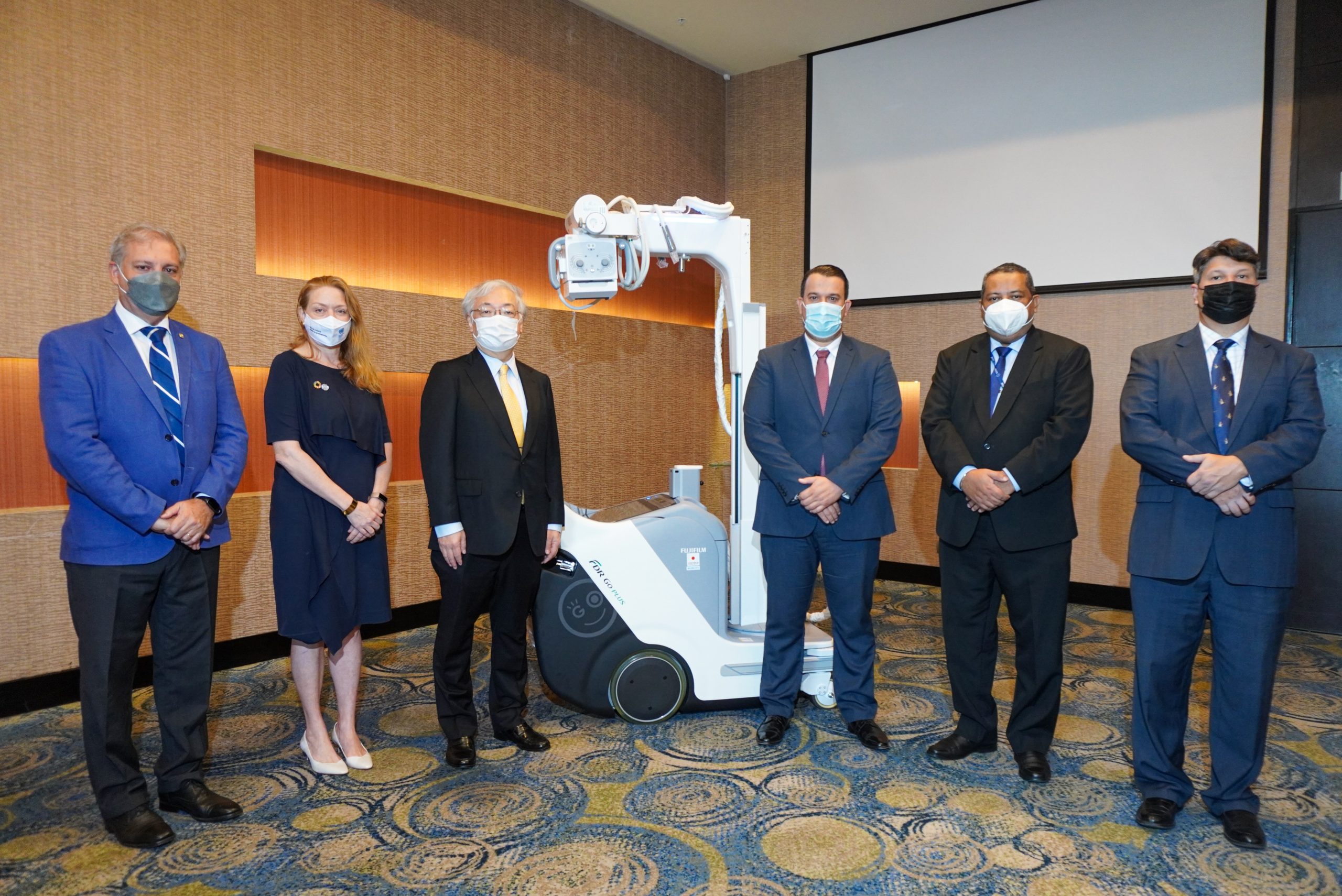 En el acto se realizó la donación simbólica de los últimos equipos médicos, 12 rayos x móviles que permitirán tomar imágenes de pulmones de forma más rápida para el abordaje de pacientes con afecciones respiratorias en Cañas, Ciudad Quesada, Pococí, Puntarenas, Puriscal, San José, San Ramón y Upala.