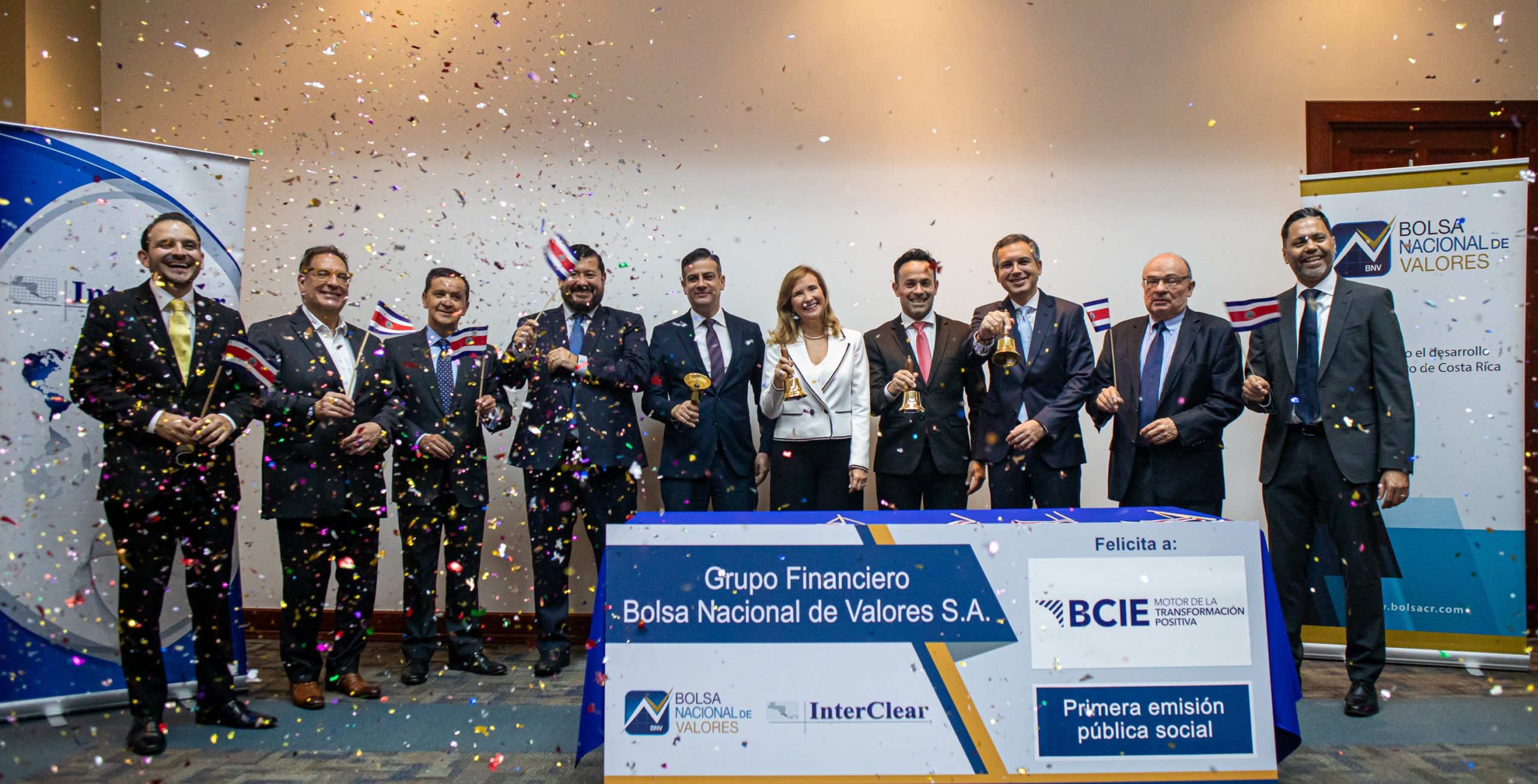 Como parte del hito histórico que representó la primera emisión pública social del Banco Centroamericano de Integración Económica (BCIE) en Costa Rica, el Grupo Financiero Bolsa Nacional de Valores lo celebró con el tradicional acto de “campanazo” que oficializó la llegada de esta nueva emisión al país.