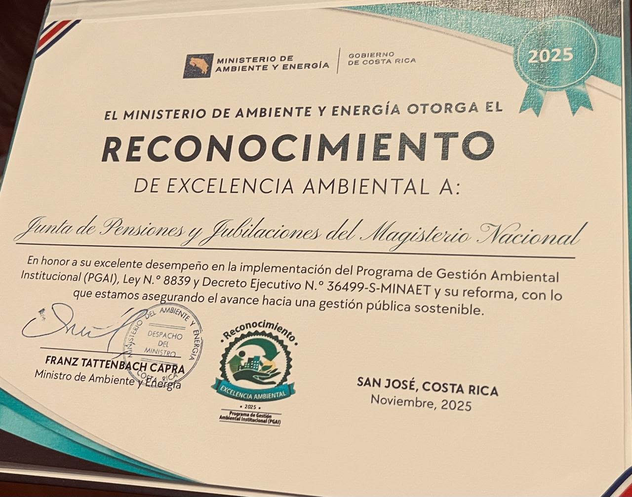 La Junta de Pensiones y Jubilaciones del Magisterio Nacional (JUPEMA) recibió un reconocimiento por su gestión ambiental institucional, tras alcanzar una calificación de 93,26% en la implementación del Programa de Gestión Ambiental Institucional (PGAI) correspondiente al periodo 2024.